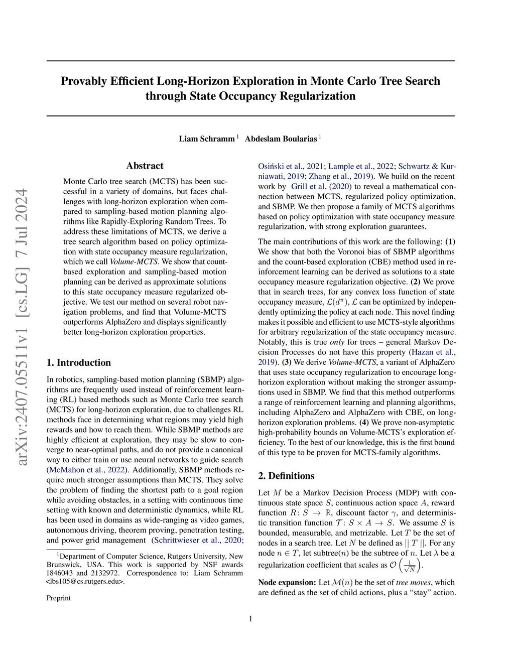 Monte Carlo tree search (MCTS) has been successful in a variety of domains, but faces challenges with long-horizon exploration when compared to sampling-based motion planning algorithms like Rapidly-Exploring Random Trees. To address these limitations of MCTS, we derive a tree search algorithm based on policy optimization with state occupancy measure regularization, which we call {\it Volume-MCTS}. We show that count-based exploration and sampling-based motion planning can be derived as approximate solutions to this state occupancy measure regularized objective. We test our method on several robot navigation problems, and find that Volume-MCTS outperforms AlphaZero and displays significantly better long-horizon exploration properties.