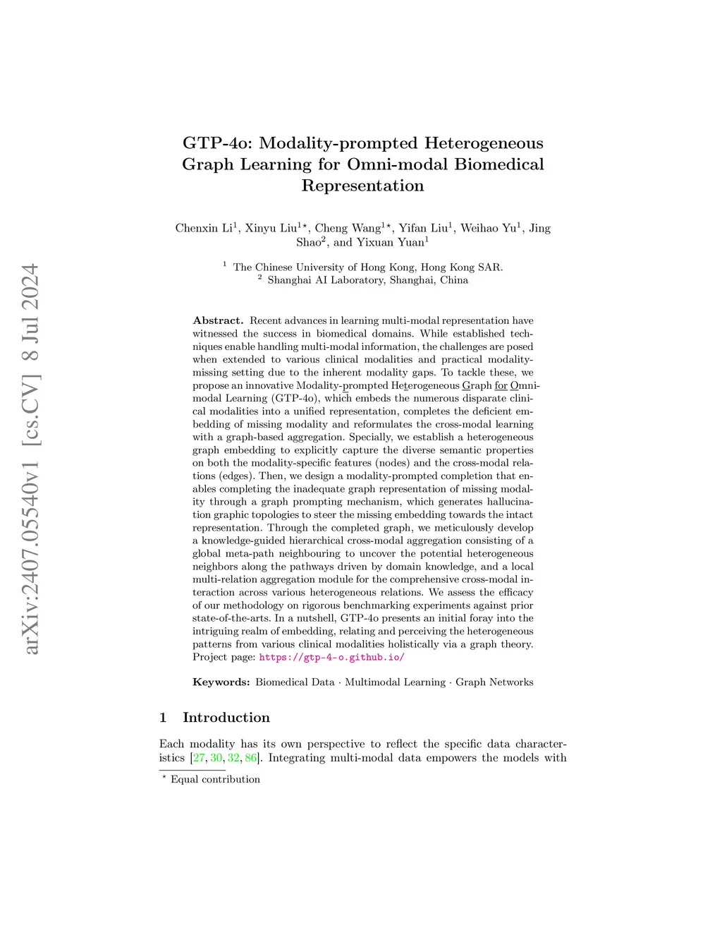 Recent advances in learning multi-modal representation have witnessed the success in biomedical domains. While established techniques enable handling multi-modal information, the challenges are posed when extended to various clinical modalities and practical modalitymissing setting due to the inherent modality gaps. To tackle these, we propose an innovative Modality-prompted Heterogeneous Graph for Omnimodal Learning (GTP-4o), which embeds the numerous disparate clinical modalities into a unified representation, completes the deficient embedding of missing modality and reformulates the cross-modal learning with a graph-based aggregation. Specially, we establish a heterogeneous graph embedding to explicitly capture the diverse semantic properties on both the modality-specific features (nodes) and the cross-modal relations (edges). Then, we design a modality-prompted completion that enables completing the inadequate graph representation of missing modality through a graph prompting mechanism, which generates hallucination graphic topologies to steer the missing embedding towards the intact representation. Through the completed graph, we meticulously develop a knowledge-guided hierarchical cross-modal aggregation consisting of a global meta-path neighbouring to uncover the potential heterogeneous neighbors along the pathways driven by domain knowledge, and a local multi-relation aggregation module for the comprehensive cross-modal interaction across various heterogeneous relations. We assess the efficacy of our methodology on rigorous benchmarking experiments against prior state-of-the-arts. In a nutshell, GTP-4o presents an initial foray into the intriguing realm of embedding, relating and perceiving the heterogeneous patterns from various clinical modalities holistically via a graph theory. Project page: https://gtp-4-o.github.io/.