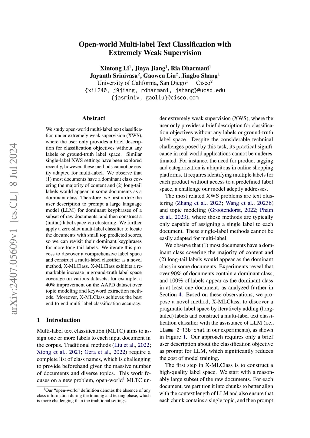 We study open-world multi-label text classification under extremely weak supervision (XWS), where the user only provides a brief description for classification objectives without any labels or ground-truth label space. Similar single-label XWS settings have been explored recently, however, these methods cannot be easily adapted for multi-label. We observe that (1) most documents have a dominant class covering the majority of content and (2) long-tail labels would appear in some documents as a dominant class. Therefore, we first utilize the user description to prompt a large language model (LLM) for dominant keyphrases of a subset of raw documents, and then construct a (initial) label space via clustering. We further apply a zero-shot multi-label classifier to locate the documents with small top predicted scores, so we can revisit their dominant keyphrases for more long-tail labels. We iterate this process to discover a comprehensive label space and construct a multi-label classifier as a novel method, X-MLClass. X-MLClass exhibits a remarkable increase in ground-truth label space coverage on various datasets, for example, a 40% improvement on the AAPD dataset over topic modeling and keyword extraction methods. Moreover, X-MLClass achieves the best end-to-end multi-label classification accuracy.