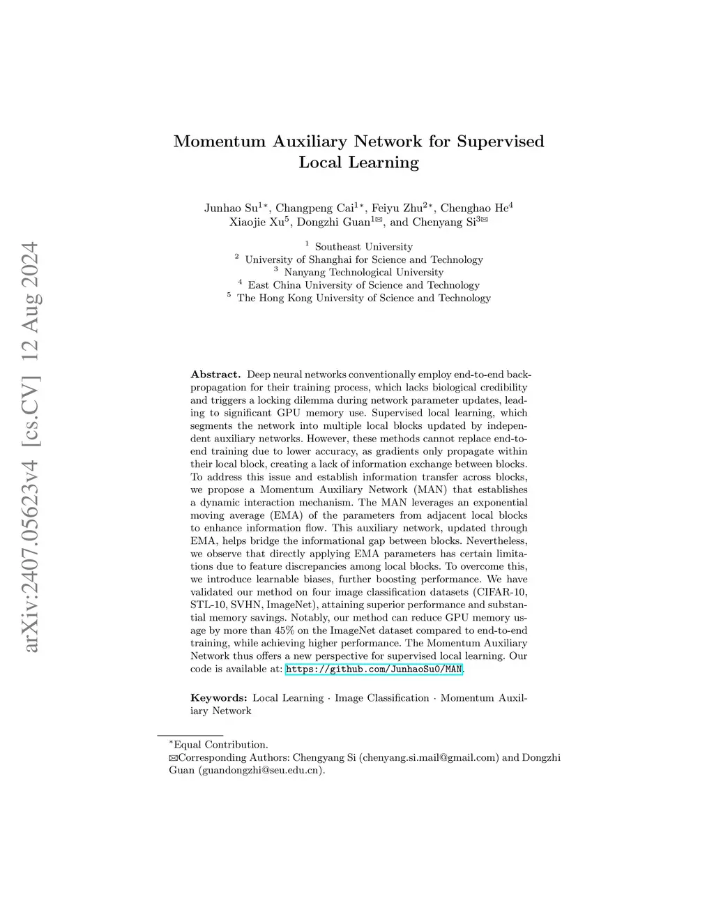 Deep neural networks conventionally employ end-to-end backpropagation for their training process, which lacks biological credibility and triggers a locking dilemma during network parameter updates, leading to significant GPU memory use. Supervised local learning, which segments the network into multiple local blocks updated by independent auxiliary networks. However, these methods cannot replace end-to-end training due to lower accuracy, as gradients only propagate within their local block, creating a lack of information exchange between blocks. To address this issue and establish information transfer across blocks, we propose a Momentum Auxiliary Network (MAN) that establishes a dynamic interaction mechanism. The MAN leverages an exponential moving average (EMA) of the parameters from adjacent local blocks to enhance information flow. This auxiliary network, updated through EMA, helps bridge the informational gap between blocks. Nevertheless, we observe that directly applying EMA parameters has certain limitations due to feature discrepancies among local blocks. To overcome this, we introduce learnable biases, further boosting performance. We have validated our method on four image classification datasets (CIFAR-10, STL-10, SVHN, ImageNet), attaining superior performance and substantial memory savings. Notably, our method can reduce GPU memory usage by more than 45\% on the ImageNet dataset compared to end-to-end training, while achieving higher performance. The Momentum Auxiliary Network thus offers a new perspective for supervised local learning. Our code is available at: https://github.com/JunhaoSu0/MAN.