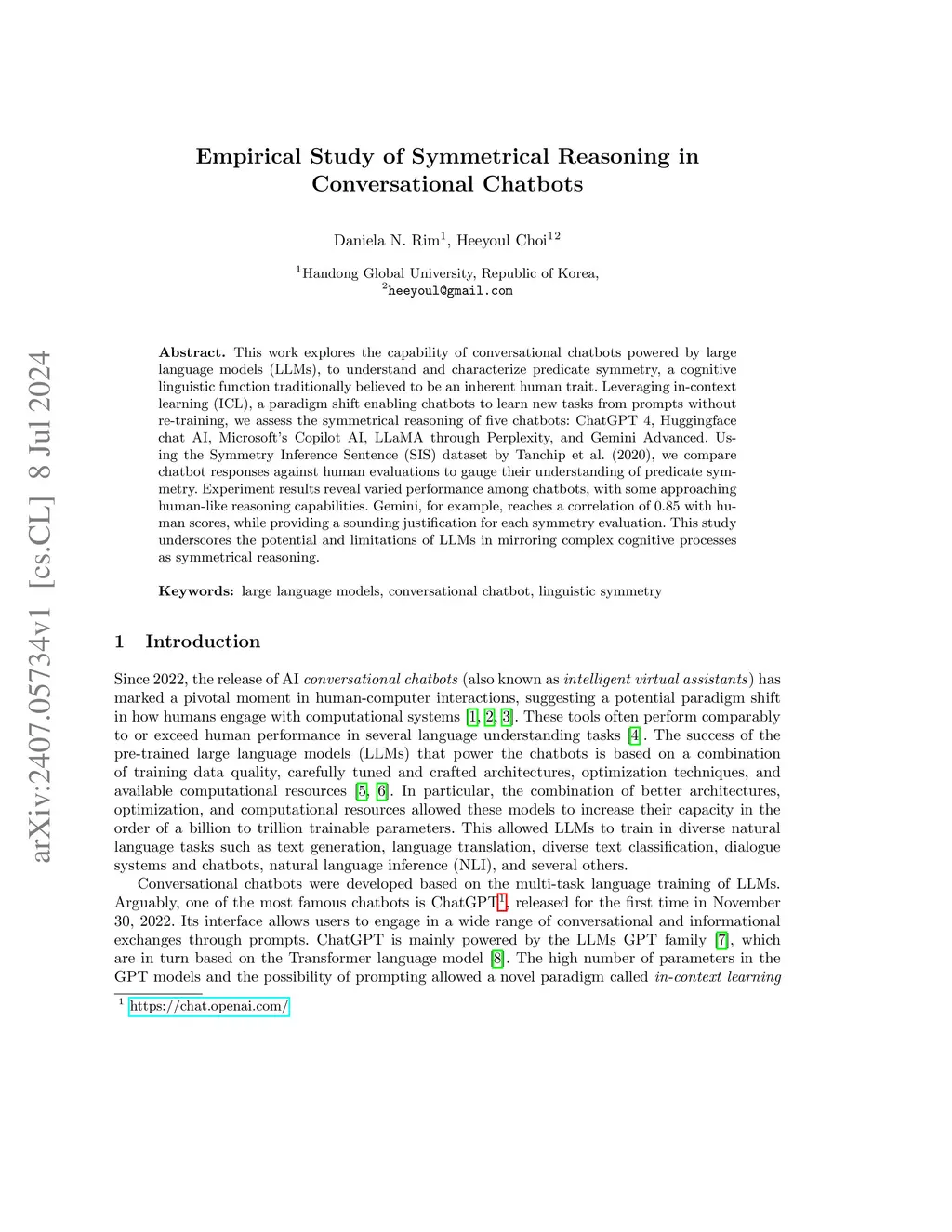 This work explores the capability of conversational chatbots powered by large language models (LLMs), to understand and characterize predicate symmetry, a cognitive linguistic function traditionally believed to be an inherent human trait. Leveraging in-context learning (ICL), a paradigm shift enabling chatbots to learn new tasks from prompts without re-training, we assess the symmetrical reasoning of five chatbots: ChatGPT 4, Huggingface chat AI, Microsoft's Copilot AI, LLaMA through Perplexity, and Gemini Advanced. Using the Symmetry Inference Sentence (SIS) dataset by Tanchip et al. (2020), we compare chatbot responses against human evaluations to gauge their understanding of predicate symmetry. Experiment results reveal varied performance among chatbots, with some approaching human-like reasoning capabilities. Gemini, for example, reaches a correlation of 0.85 with human scores, while providing a sounding justification for each symmetry evaluation. This study underscores the potential and limitations of LLMs in mirroring complex cognitive processes as symmetrical reasoning.