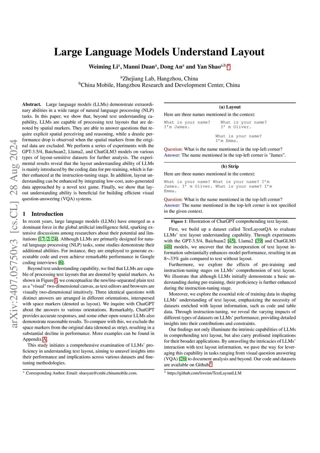 Large language models (LLMs) demonstrate extraordinary abilities in a wide range of natural language processing (NLP) tasks. In this paper, we show that, beyond text understanding capability, LLMs are capable of processing text layouts that are denoted by spatial markers. They are able to answer questions that require explicit spatial perceiving and reasoning, while a drastic performance drop is observed when the spatial markers from the original data are excluded. We perform a series of experiments with the GPT-3.5, Baichuan2, Llama2 and ChatGLM3 models on various types of layout-sensitive datasets for further analysis. The experimental results reveal that the layout understanding ability of LLMs is mainly introduced by the coding data for pretraining, which is further enhanced at the instruction-tuning stage. In addition, layout understanding can be enhanced by integrating low-cost, auto-generated data approached by a novel text game. Finally, we show that layout understanding ability is beneficial for building efficient visual question-answering (VQA) systems.