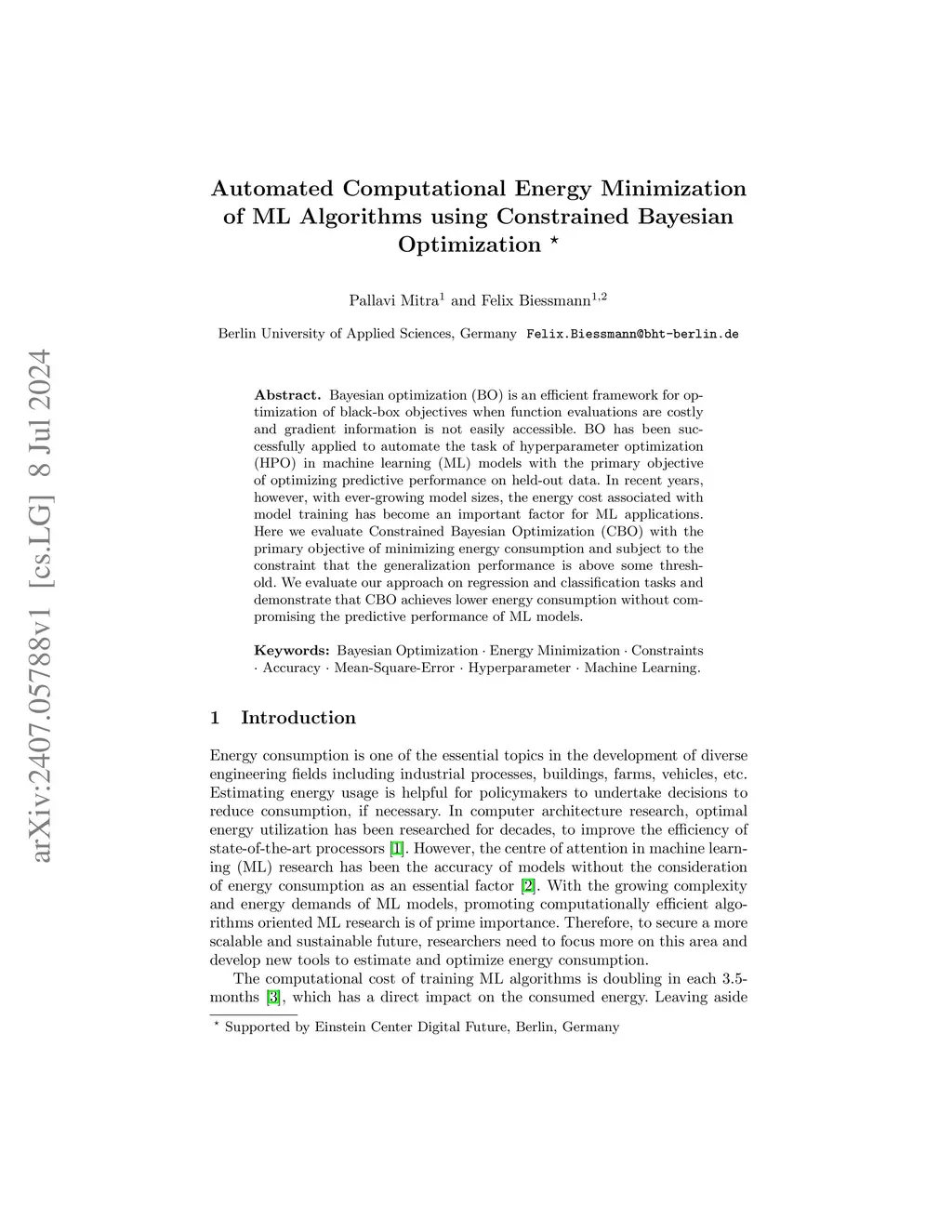 Bayesian optimization (BO) is an efficient framework for optimization of black-box objectives when function evaluations are costly and gradient information is not easily accessible. BO has been successfully applied to automate the task of hyperparameter optimization (HPO) in machine learning (ML) models with the primary objective of optimizing predictive performance on held-out data. In recent years, however, with ever-growing model sizes, the energy cost associated with model training has become an important factor for ML applications. Here we evaluate Constrained Bayesian Optimization (CBO) with the primary objective of minimizing energy consumption and subject to the constraint that the generalization performance is above some threshold. We evaluate our approach on regression and classification tasks and demonstrate that CBO achieves lower energy consumption without compromising the predictive performance of ML models.