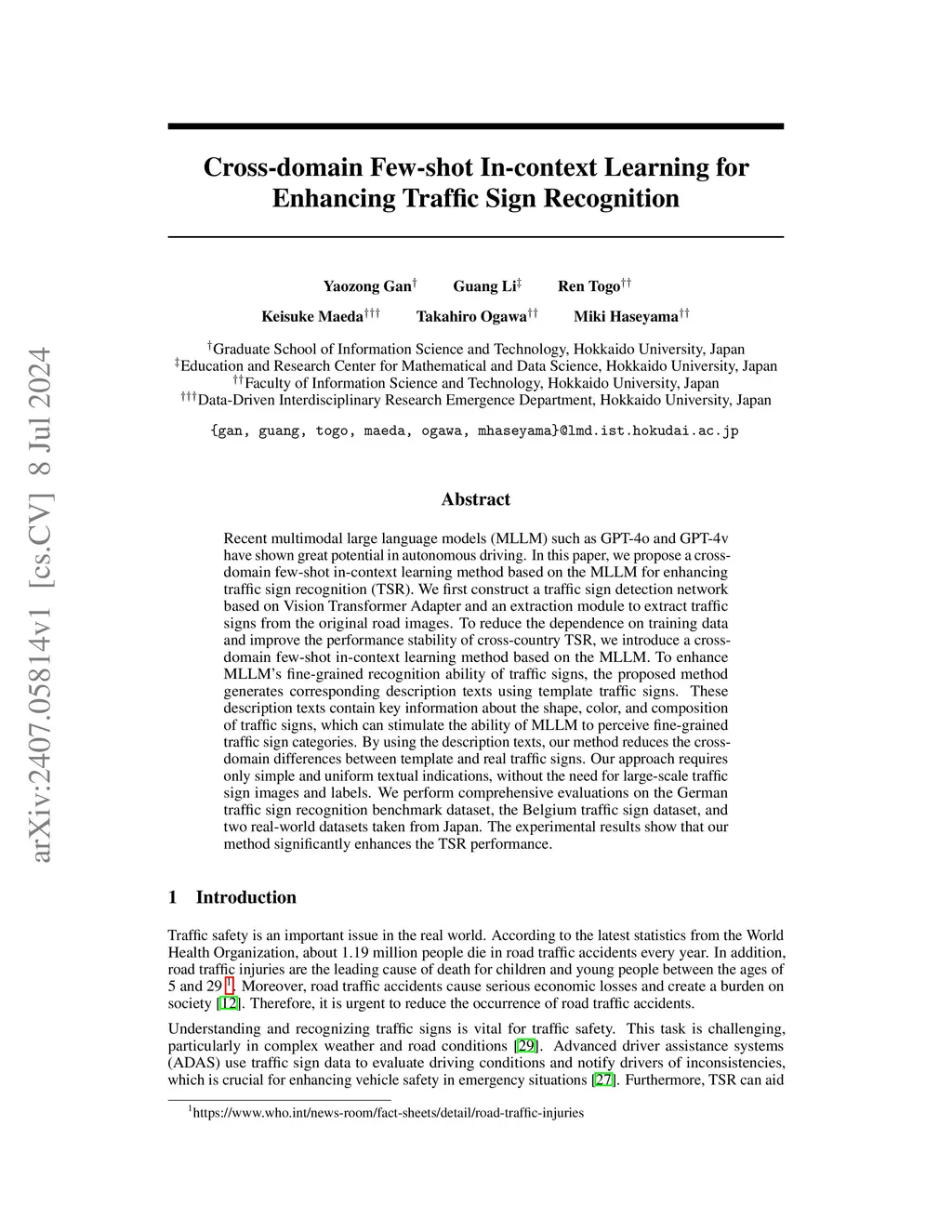 Recent multimodal large language models (MLLM) such as GPT-4o and GPT-4v have shown great potential in autonomous driving. In this paper, we propose a cross-domain few-shot in-context learning method based on the MLLM for enhancing traffic sign recognition (TSR). We first construct a traffic sign detection network based on Vision Transformer Adapter and an extraction module to extract traffic signs from the original road images. To reduce the dependence on training data and improve the performance stability of cross-country TSR, we introduce a cross-domain few-shot in-context learning method based on the MLLM. To enhance MLLM's fine-grained recognition ability of traffic signs, the proposed method generates corresponding description texts using template traffic signs. These description texts contain key information about the shape, color, and composition of traffic signs, which can stimulate the ability of MLLM to perceive fine-grained traffic sign categories. By using the description texts, our method reduces the cross-domain differences between template and real traffic signs. Our approach requires only simple and uniform textual indications, without the need for large-scale traffic sign images and labels. We perform comprehensive evaluations on the German traffic sign recognition benchmark dataset, the Belgium traffic sign dataset, and two real-world datasets taken from Japan. The experimental results show that our method significantly enhances the TSR performance.