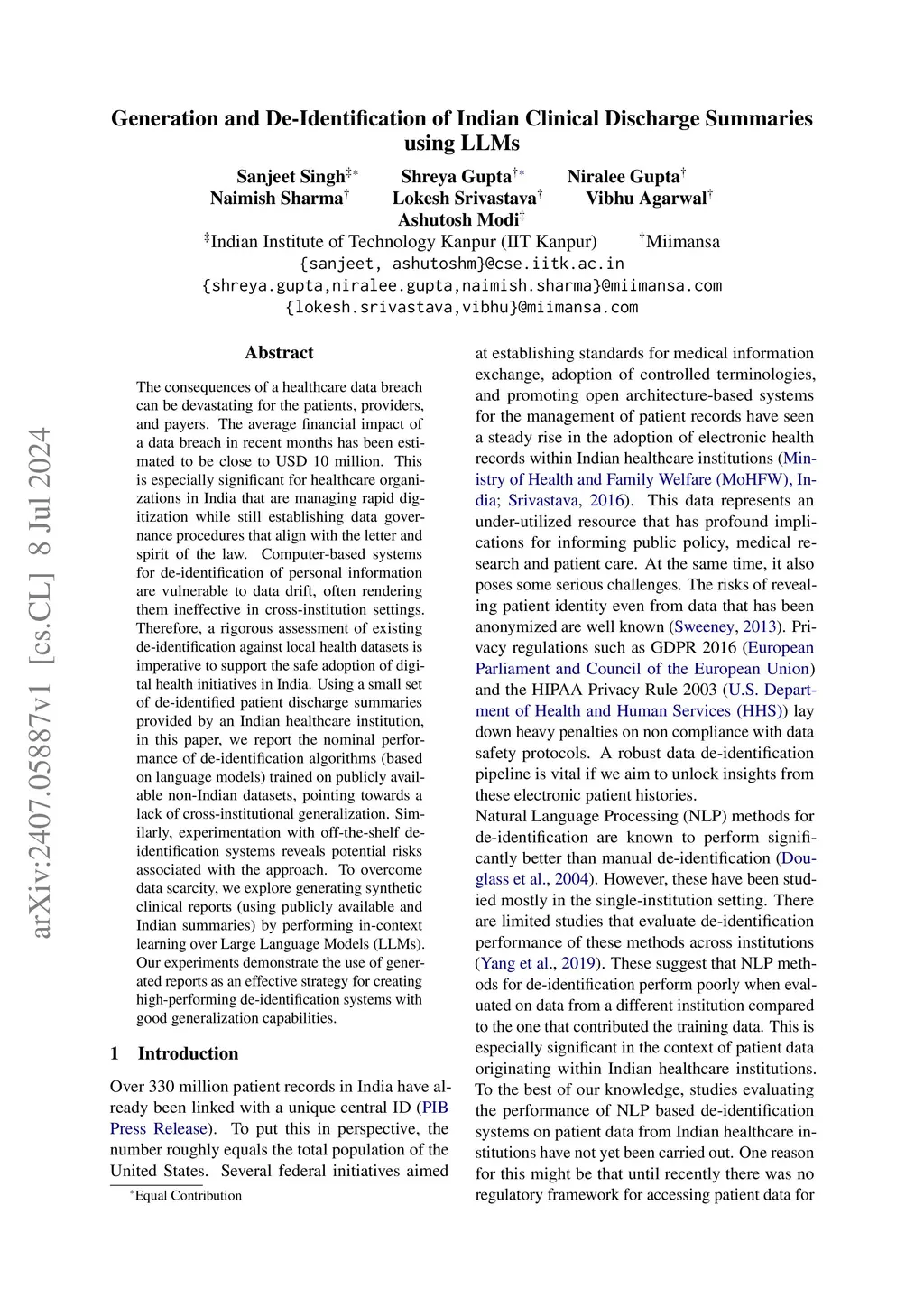Generation and De-Identification of Indian Clinical Discharge Summaries