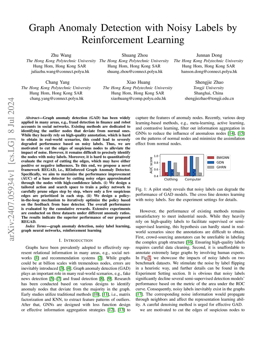 Graph anomaly detection (GAD) is widely applied in many areas, such as financial fraud detection and social spammer detection. Anomalous nodes in the graph not only impact their own communities but also create a ripple effect on neighbors throughout the graph structure. Detecting anomalous nodes in complex graphs has been a challenging task. While existing GAD methods assume all labels are correct, real-world scenarios often involve inaccurate annotations. These noisy labels can severely degrade GAD performance because, with anomalies representing a minority class, even a small number of mislabeled instances can disproportionately interfere with detection models. Cutting edges to mitigate the negative effects of noisy labels is a good option; however, it has both positive and negative influences and also presents an issue of weak supervision. To perform effective GAD with noisy labels, we propose REinforced Graph Anomaly Detector (REGAD) by pruning the edges of candidate nodes potentially with mistaken labels. Moreover, we design the performance feedback based on strategically crafted confident labels to guide the cutting process, ensuring optimal results. Specifically, REGAD contains two novel components. (i) A tailored policy network, which involves two-step actions to remove negative effect propagation step by step. (ii) A policy-in-the-loop mechanism to identify suitable edge removal strategies that control the propagation of noise on the graph and estimate the updated structure to obtain reliable pseudo labels iteratively. Experiments on three real-world datasets demonstrate that REGAD outperforms all baselines under different noisy ratios.