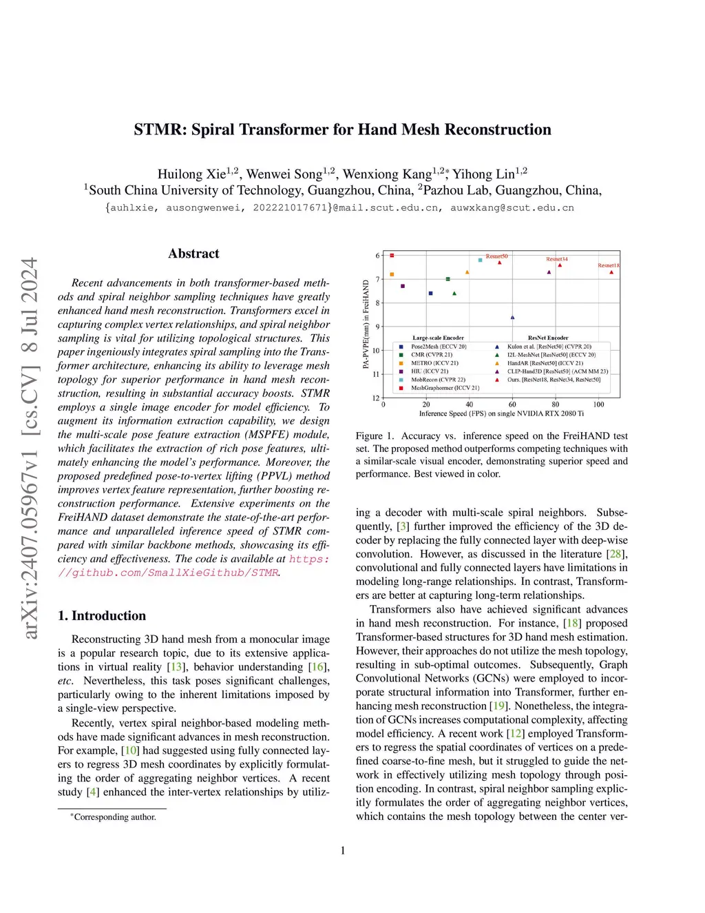 Recent advancements in both transformer-based methods and spiral neighbor sampling techniques have greatly enhanced hand mesh reconstruction. Transformers excel in capturing complex vertex relationships, and spiral neighbor sampling is vital for utilizing topological structures. This paper ingeniously integrates spiral sampling into the Transformer architecture, enhancing its ability to leverage mesh topology for superior performance in hand mesh reconstruction, resulting in substantial accuracy boosts. STMR employs a single image encoder for model efficiency. To augment its information extraction capability, we design the multi-scale pose feature extraction (MSPFE) module, which facilitates the extraction of rich pose features, ultimately enhancing the model's performance. Moreover, the proposed predefined pose-to-vertex lifting (PPVL) method improves vertex feature representation, further boosting reconstruction performance. Extensive experiments on the FreiHAND dataset demonstrate the state-of-the-art performance and unparalleled inference speed of STMR compared with similar backbone methods, showcasing its efficiency and effectiveness. The code is available at https://github.com/SmallXieGithub/STMR.