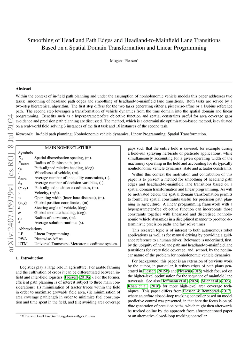 Smoothing of Headland Path Edges and Headland-to-Mainfield Lane Transitions Based on a Spatial Domain Transformation and Linear Programming