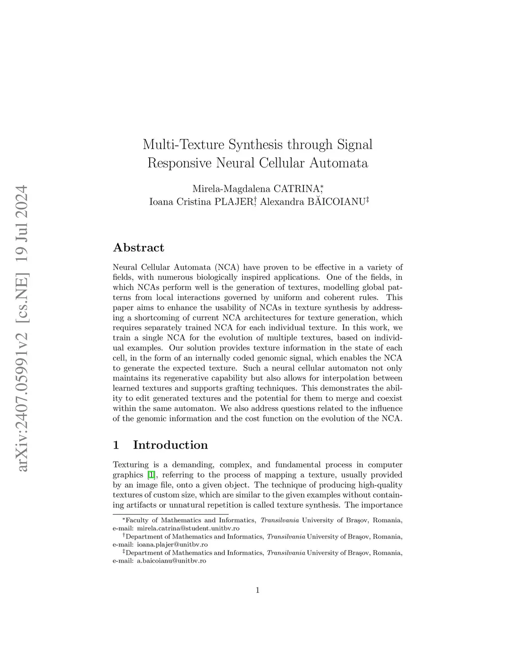 Neural Cellular Automata (NCA) have proven to be effective in a variety of fields, with numerous biologically inspired applications. One of the fields, in which NCAs perform well is the generation of textures, modelling global patterns from local interactions governed by uniform and coherent rules. This paper aims to enhance the usability of NCAs in texture synthesis by addressing a shortcoming of current NCA architectures for texture generation, which requires separately trained NCA for each individual texture. In this work, we train a single NCA for the evolution of multiple textures, based on individual examples. Our solution provides texture information in the state of each cell, in the form of an internally coded genomic signal, which enables the NCA to generate the expected texture. Such a neural cellular automaton not only maintains its regenerative capability but also allows for interpolation between learned textures and supports grafting techniques. This demonstrates the ability to edit generated textures and the potential for them to merge and coexist within the same automaton. We also address questions related to the influence of the genomic information and the cost function on the evolution of the NCA.
