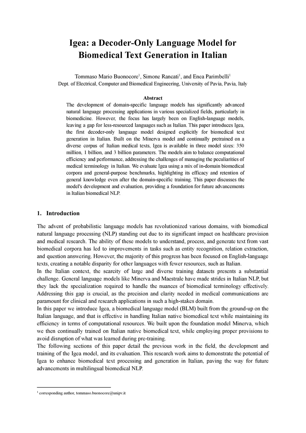 The development of domain-specific language models has significantly advanced natural language processing applications in various specialized fields, particularly in biomedicine. However, the focus has largely been on English-language models, leaving a gap for less-resourced languages such as Italian. This paper introduces Igea, the first decoder-only language model designed explicitly for biomedical text generation in Italian. Built on the Minerva model and continually pretrained on a diverse corpus of Italian medical texts, Igea is available in three model sizes: 350 million, 1 billion, and 3 billion parameters. The models aim to balance computational efficiency and performance, addressing the challenges of managing the peculiarities of medical terminology in Italian. We evaluate Igea using a mix of in-domain biomedical corpora and general-purpose benchmarks, highlighting its efficacy and retention of general knowledge even after the domain-specific training. This paper discusses the model's development and evaluation, providing a foundation for future advancements in Italian biomedical NLP.