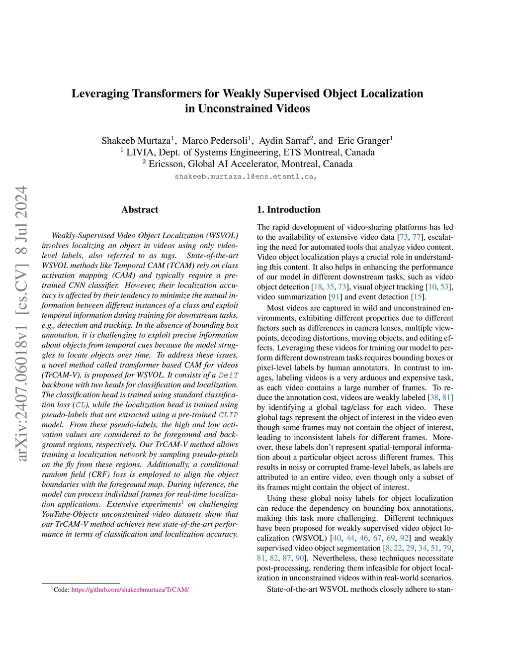 Weakly-Supervised Video Object Localization (WSVOL) involves localizing an object in videos using only video-level labels, also referred to as tags. State-of-the-art WSVOL methods like Temporal CAM (TCAM) rely on class activation mapping (CAM) and typically require a pre-trained CNN classifier. However, their localization accuracy is affected by their tendency to minimize the mutual information between different instances of a class and exploit temporal information during training for downstream tasks, e.g., detection and tracking. In the absence of bounding box annotation, it is challenging to exploit precise information about objects from temporal cues because the model struggles to locate objects over time. To address these issues, a novel method called transformer based CAM for videos (TrCAM-V), is proposed for WSVOL. It consists of a DeiT backbone with two heads for classification and localization. The classification head is trained using standard classification loss (CL), while the localization head is trained using pseudo-labels that are extracted using a pre-trained CLIP model. From these pseudo-labels, the high and low activation values are considered to be foreground and background regions, respectively. Our TrCAM-V method allows training a localization network by sampling pseudo-pixels on the fly from these regions. Additionally, a conditional random field (CRF) loss is employed to align the object boundaries with the foreground map. During inference, the model can process individual frames for real-time localization applications. Extensive experiments on challenging YouTube-Objects unconstrained video datasets show that our TrCAM-V method achieves new state-of-the-art performance in terms of classification and localization accuracy.
