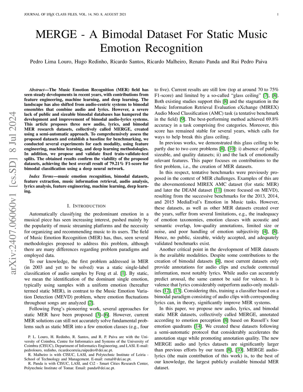 MERGE -- A Bimodal Audio-Lyrics Dataset for Static Music Emotion Recognition