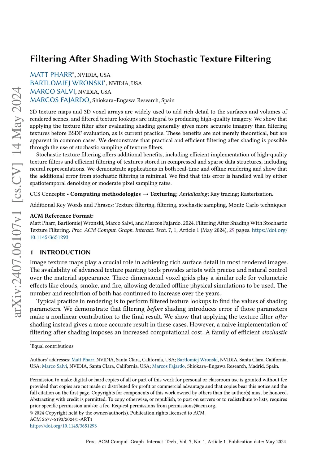 2D texture maps and 3D voxel arrays are widely used to add rich detail to the surfaces and volumes of rendered scenes, and filtered texture lookups are integral to producing high-quality imagery. We show that applying the texture filter after evaluating shading generally gives more accurate imagery than filtering textures before BSDF evaluation, as is current practice. These benefits are not merely theoretical, but are apparent in common cases. We demonstrate that practical and efficient filtering after shading is possible through the use of stochastic sampling of texture filters. Stochastic texture filtering offers additional benefits, including efficient implementation of high-quality texture filters and efficient filtering of textures stored in compressed and sparse data structures, including neural representations. We demonstrate applications in both real-time and offline rendering and show that the additional error from stochastic filtering is minimal. We find that this error is handled well by either spatiotemporal denoising or moderate pixel sampling rates.