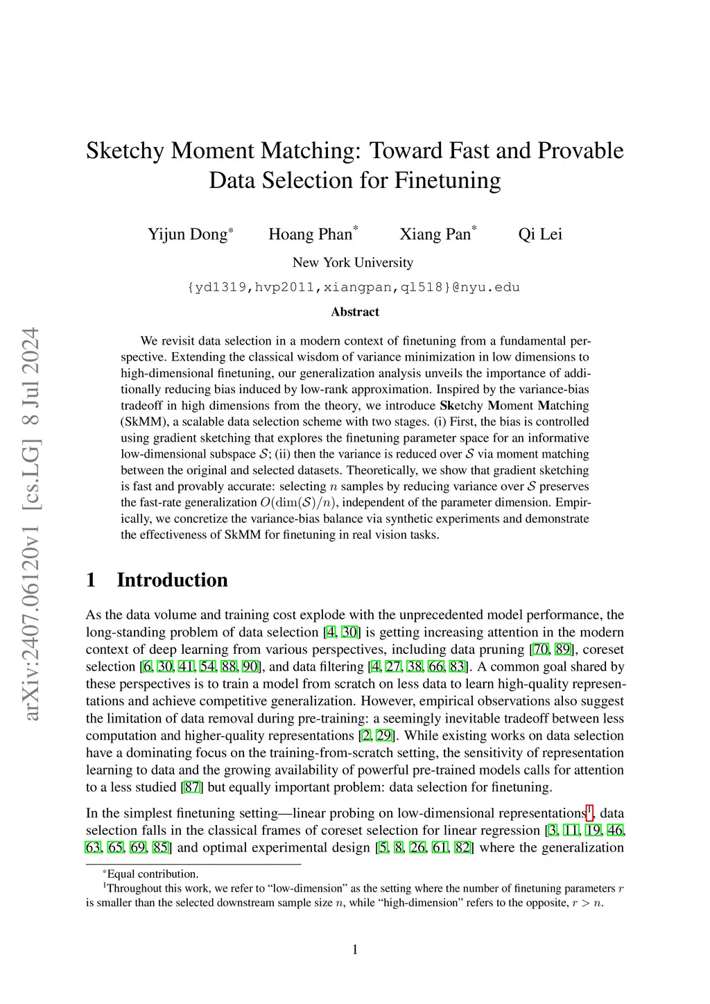 We revisit data selection in a modern context of finetuning from a fundamental perspective. Extending the classical wisdom of variance minimization in low dimensions to high-dimensional finetuning, our generalization analysis unveils the importance of additionally reducing bias induced by low-rank approximation. Inspired by the variance-bias tradeoff in high dimensions from the theory, we introduce Sketchy Moment Matching (SkMM), a scalable data selection scheme with two stages. (i) First, the bias is controlled using gradient sketching that explores the finetuning parameter space for an informative low-dimensional subspace ; (ii) then the variance is reduced over via moment matching between the original and selected datasets. Theoretically, we show that gradient sketching is fast and provably accurate: selecting samples by reducing variance over preserves the fast-rate generalization , independent of the parameter dimension. Empirically, we concretize the variance-bias balance via synthetic experiments and demonstrate the effectiveness of SkMM for finetuning in real vision tasks.
