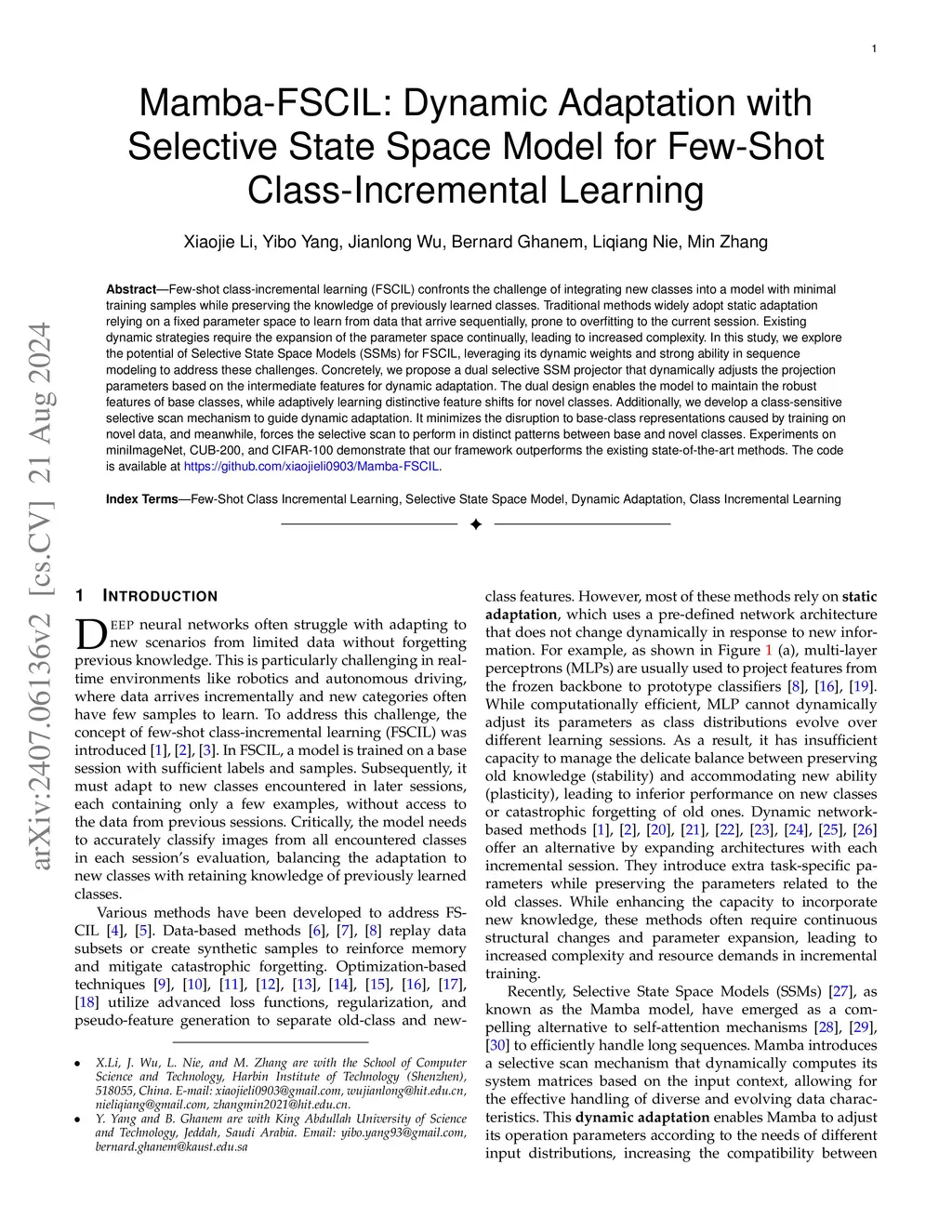 Few-shot class-incremental learning (FSCIL) aims to incrementally learn novel classes from limited examples while preserving knowledge of previously learned classes. Existing methods face a critical dilemma: static architectures rely on a fixed parameter space to learn from data that arrive sequentially, prone to overfitting to the current session, while dynamic architectures require the expansion of the parameter space continually, leading to increased complexity. In this study, we explore the potential of Selective State Space Models (SSMs) for FSCIL. Mamba leverages its input-dependent parameters to dynamically adjust its processing patterns and generate content-aware scan patterns within a fixed architecture. This enables it to configure distinct processing for base and novel classes, effectively preserving existing knowledge while adapting to new ones. To leverage Mamba's potential for FSCIL, we design two key modules: First, we propose a dual selective SSM projector that dynamically adjusts the projection parameters based on the intermediate features for dynamic adaptation. The dual-design structurally decouples base and novel class processing with a frozen base branch, employing a frozen base branch to maintain robust base-class features and a dynamic incremental branch that adaptively learns distinctive feature shifts for novel classes. Second, we develop a class-sensitive selective scan mechanism to guide dynamic adaptation of the incremental branch. It minimizes the disruption to base-class representations caused by training on novel data, and meanwhile, forces the selective scan to perform in distinct patterns between base and novel classes. Extensive experiments on miniImageNet, CUB-200, and CIFAR-100 demonstrate that Mamba-FSCIL achieves state-of-the-art performance. The code is available atthis https URL.