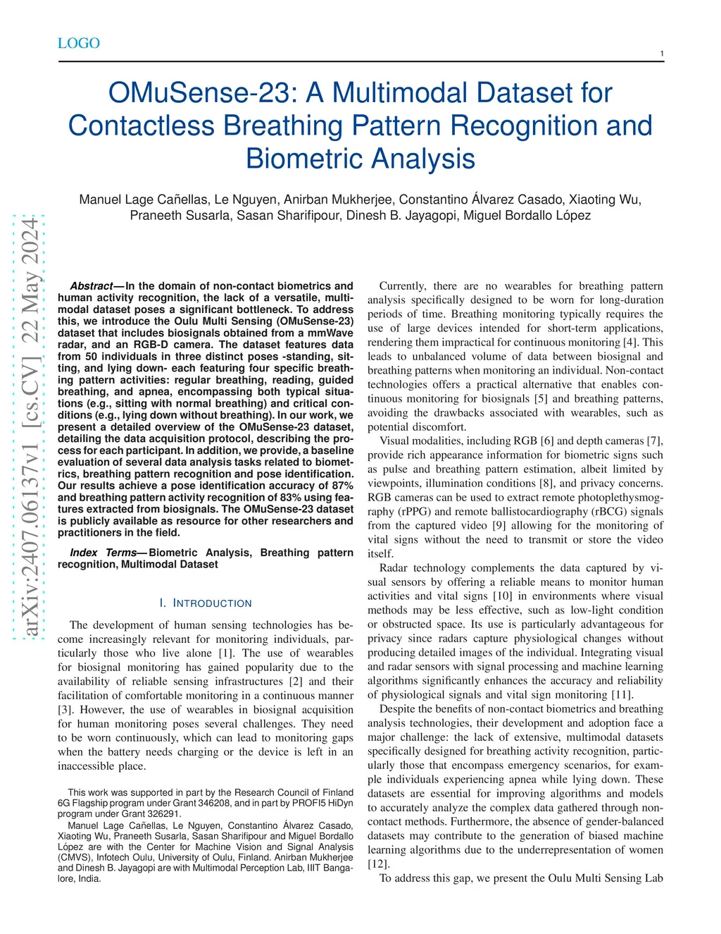 In the domain of non-contact biometrics and human activity recognition, the lack of a versatile, multimodal dataset poses a significant bottleneck. To address this, we introduce the Oulu Multi Sensing (OMuSense-23) dataset that includes biosignals obtained from a mmWave radar, and an RGB-D camera. The dataset features data from 50 individuals in three distinct poses -- standing, sitting, and lying down -- each featuring four specific breathing pattern activities: regular breathing, reading, guided breathing, and apnea, encompassing both typical situations (e.g., sitting with normal breathing) and critical conditions (e.g., lying down without breathing). In our work, we present a detailed overview of the OMuSense-23 dataset, detailing the data acquisition protocol, describing the process for each participant. In addition, we provide, a baseline evaluation of several data analysis tasks related to biometrics, breathing pattern recognition and pose identification. Our results achieve a pose identification accuracy of 87\% and breathing pattern activity recognition of 83\% using features extracted from biosignals. The OMuSense-23 dataset is publicly available as resource for other researchers and practitioners in the field.
