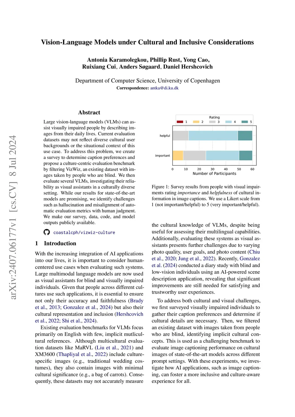 Large vision-language models (VLMs) can assist visually impaired people by describing images from their daily lives. Current evaluation datasets may not reflect diverse cultural user backgrounds or the situational context of this use case. To address this problem, we create a survey to determine caption preferences and propose a culture-centric evaluation benchmark by filtering VizWiz, an existing dataset with images taken by people who are blind. We then evaluate several VLMs, investigating their reliability as visual assistants in a culturally diverse setting. While our results for state-of-the-art models are promising, we identify challenges such as hallucination and misalignment of automatic evaluation metrics with human judgment. We make our survey, data, code, and model outputs publicly available.