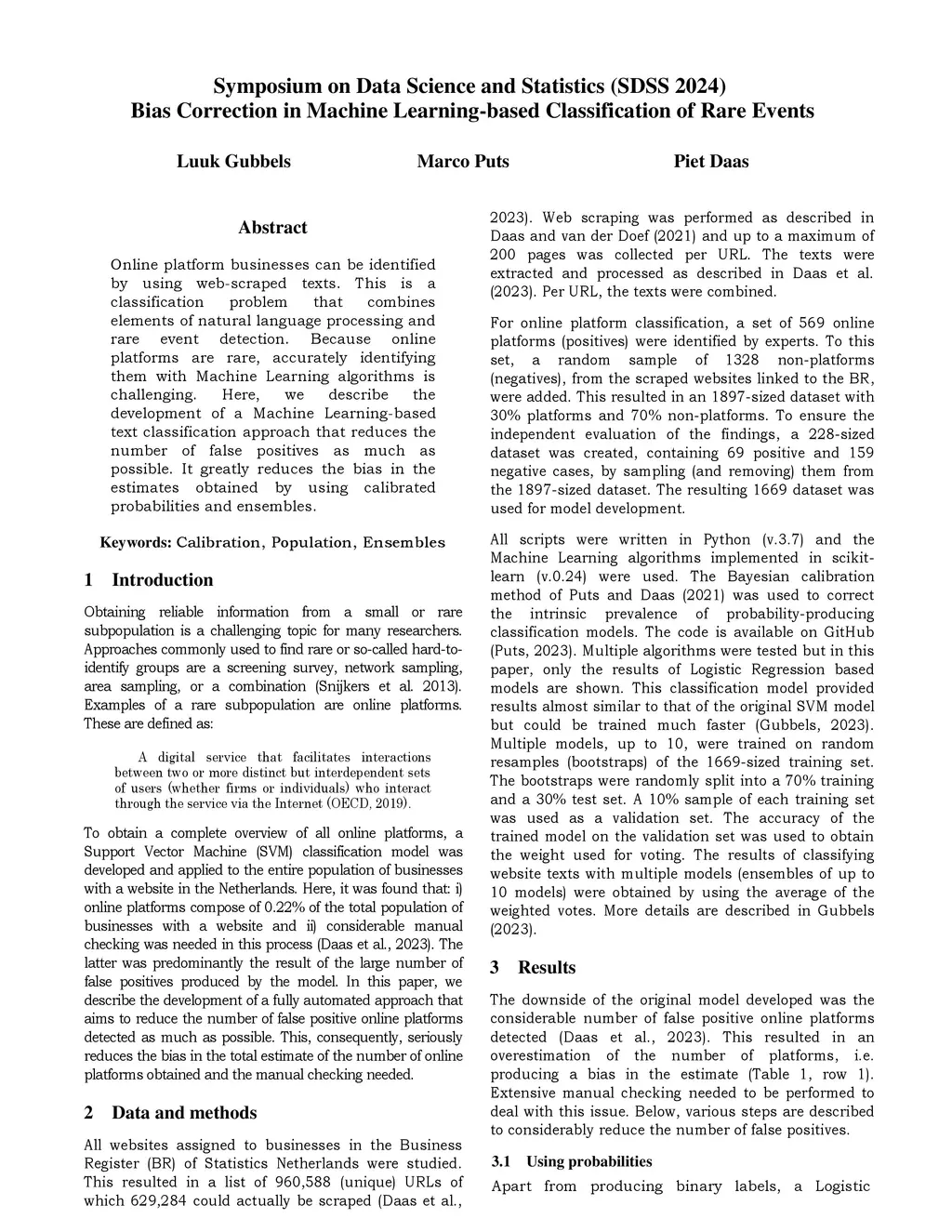 Online platform businesses can be identified by using web-scraped texts. This is a classification problem that combines elements of natural language processing and rare event detection. Because online platforms are rare, accurately identifying them with Machine Learning algorithms is challenging. Here, we describe the development of a Machine Learning-based text classification approach that reduces the number of false positives as much as possible. It greatly reduces the bias in the estimates obtained by using calibrated probabilities and ensembles.