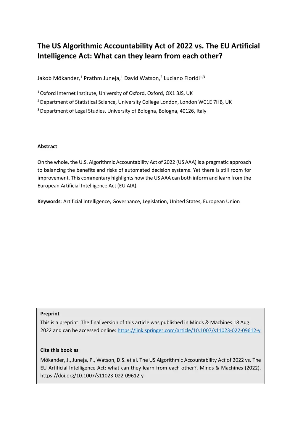 The US Algorithmic Accountability Act of 2022 vs. The EU Artificial