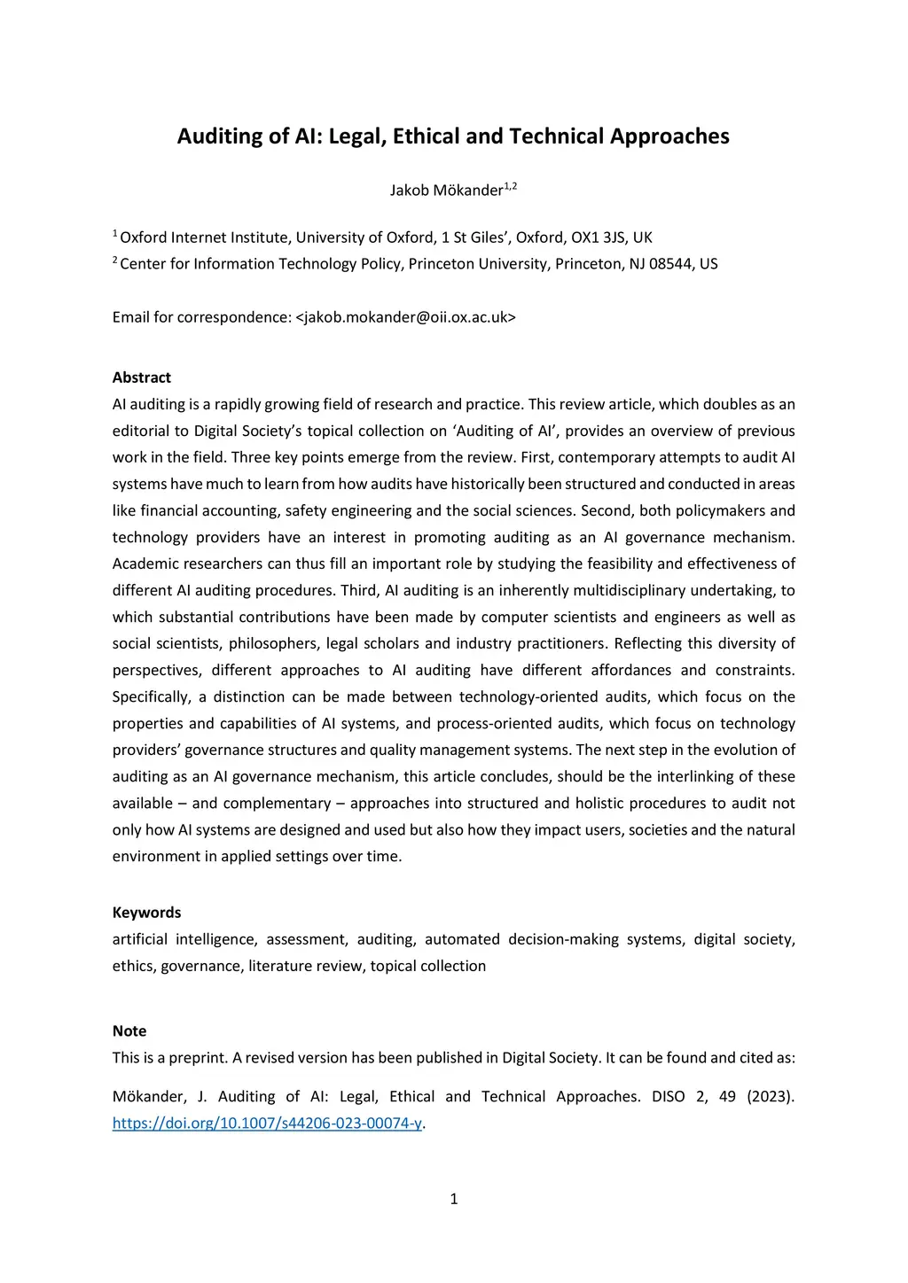 AI auditing is a rapidly growing field of research and practice. This review article, which doubles as an editorial to Digital Societys topical collection on Auditing of AI, provides an overview of previous work in the field. Three key points emerge from the review. First, contemporary attempts to audit AI systems have much to learn from how audits have historically been structured and conducted in areas like financial accounting, safety engineering and the social sciences. Second, both policymakers and technology providers have an interest in promoting auditing as an AI governance mechanism. Academic researchers can thus fill an important role by studying the feasibility and effectiveness of different AI auditing procedures. Third, AI auditing is an inherently multidisciplinary undertaking, to which substantial contributions have been made by computer scientists and engineers as well as social scientists, philosophers, legal scholars and industry practitioners. Reflecting this diversity of perspectives, different approaches to AI auditing have different affordances and constraints. Specifically, a distinction can be made between technology-oriented audits, which focus on the properties and capabilities of AI systems, and process oriented audits, which focus on technology providers governance structures and quality management systems. The next step in the evolution of auditing as an AI governance mechanism, this article concludes, should be the interlinking of these available (and complementary) approaches into structured and holistic procedures to audit not only how AI systems are designed and used but also how they impact users, societies and the natural environment in applied settings over time.