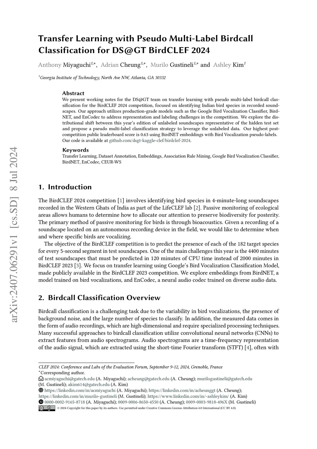 We present working notes for the DS@GT team on transfer learning with pseudo multi-label birdcall classification for the BirdCLEF 2024 competition, focused on identifying Indian bird species in recorded soundscapes. Our approach utilizes production-grade models such as the Google Bird Vocalization Classifier, BirdNET, and EnCodec to address representation and labeling challenges in the competition. We explore the distributional shift between this year's edition of unlabeled soundscapes representative of the hidden test set and propose a pseudo multi-label classification strategy to leverage the unlabeled data. Our highest post-competition public leaderboard score is 0.63 using BirdNET embeddings with Bird Vocalization pseudo-labels. Our code is available at https://github.com/dsgt-kaggle-clef/birdclef-2024