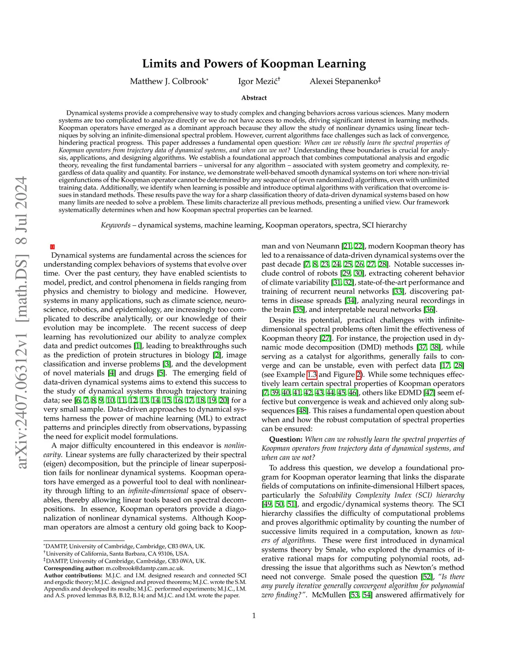 Dynamical systems provide a comprehensive way to study complex and changing behaviors across various sciences. Many modern systems are too complicated to analyze directly or we do not have access to models, driving significant interest in learning methods. Koopman operators have emerged as a dominant approach because they allow the study of nonlinear dynamics using linear techniques by solving an infinite-dimensional spectral problem. However, current algorithms face challenges such as lack of convergence, hindering practical progress. This paper addresses a fundamental open question: \textit{When can we robustly learn the spectral properties of Koopman operators from trajectory data of dynamical systems, and when can we not?} Understanding these boundaries is crucial for analysis, applications, and designing algorithms. We establish a foundational approach that combines computational analysis and ergodic theory, revealing the first fundamental barriers -- universal for any algorithm -- associated with system geometry and complexity, regardless of data quality and quantity. For instance, we demonstrate well-behaved smooth dynamical systems on tori where non-trivial eigenfunctions of the Koopman operator cannot be determined by any sequence of (even randomized) algorithms, even with unlimited training data. Additionally, we identify when learning is possible and introduce optimal algorithms with verification that overcome issues in standard methods. These results pave the way for a sharp classification theory of data-driven dynamical systems based on how many limits are needed to solve a problem. These limits characterize all previous methods, presenting a unified view. Our framework systematically determines when and how Koopman spectral properties can be learned.