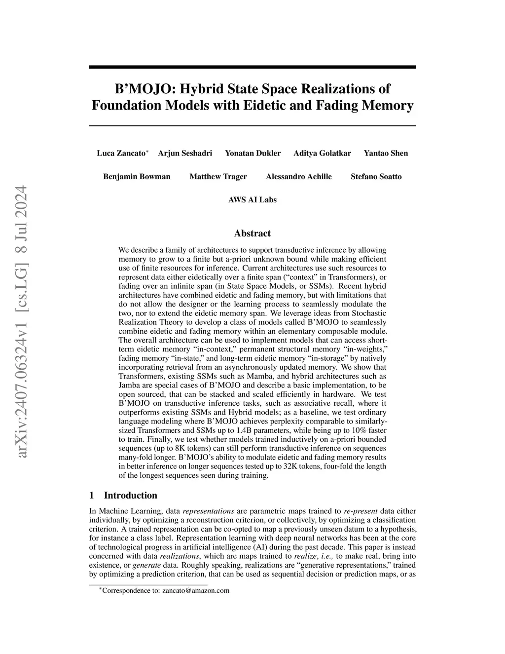 We describe a family of architectures to support transductive inference by allowing memory to grow to a finite but a-priori unknown bound while making efficient use of finite resources for inference. Current architectures use such resources to represent data either eidetically over a finite span ("context" in Transformers), or fading over an infinite span (in State Space Models, or SSMs). Recent hybrid architectures have combined eidetic and fading memory, but with limitations that do not allow the designer or the learning process to seamlessly modulate the two, nor to extend the eidetic memory span. We leverage ideas from Stochastic Realization Theory to develop a class of models called B'MOJO to seamlessly combine eidetic and fading memory within an elementary composable module. The overall architecture can be used to implement models that can access short-term eidetic memory "in-context," permanent structural memory "in-weights," fading memory "in-state," and long-term eidetic memory "in-storage" by natively incorporating retrieval from an asynchronously updated memory. We show that Transformers, existing SSMs such as Mamba, and hybrid architectures such as Jamba are special cases of B'MOJO and describe a basic implementation, to be open sourced, that can be stacked and scaled efficiently in hardware. We test B'MOJO on transductive inference tasks, such as associative recall, where it outperforms existing SSMs and Hybrid models; as a baseline, we test ordinary language modeling where B'MOJO achieves perplexity comparable to similarly-sized Transformers and SSMs up to 1.4B parameters, while being up to 10% faster to train. Finally, we show that B'MOJO's ability to modulate eidetic and fading memory results in better inference on longer sequences tested up to 32K tokens, four-fold the length of the longest sequences seen during training.
