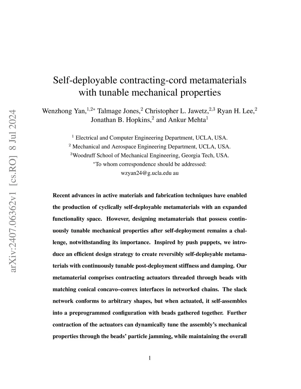 Self-deployable contracting-cord metamaterials with tunable mechanical