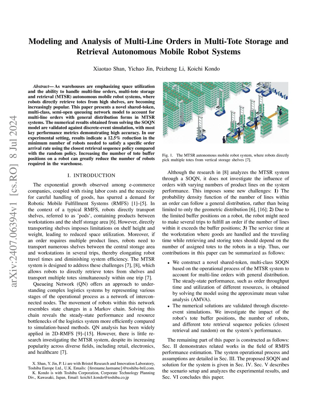 As warehouses are emphasizing space utilization and the ability to handle multi-line orders, multi-tote storage and retrieval (MTSR) autonomous mobile robot systems, where robots directly retrieve totes from high shelves, are becoming increasingly popular. This paper presents a novel shared-token, multi-class, semi-open queueing network model to account for multi-line orders with general distribution forms in MTSR systems. The numerical results obtained from solving the SOQN model are validated against discrete-event simulation, with most key performance metrics demonstrating high accuracy. In our experimental setting, results indicate a 12.5% reduction in the minimum number of robots needed to satisfy a specific order arrival rate using the closest retrieval sequence policy compared with the random policy. Increasing the number of tote buffer positions on a robot can greatly reduce the number of robots required in the warehouse.