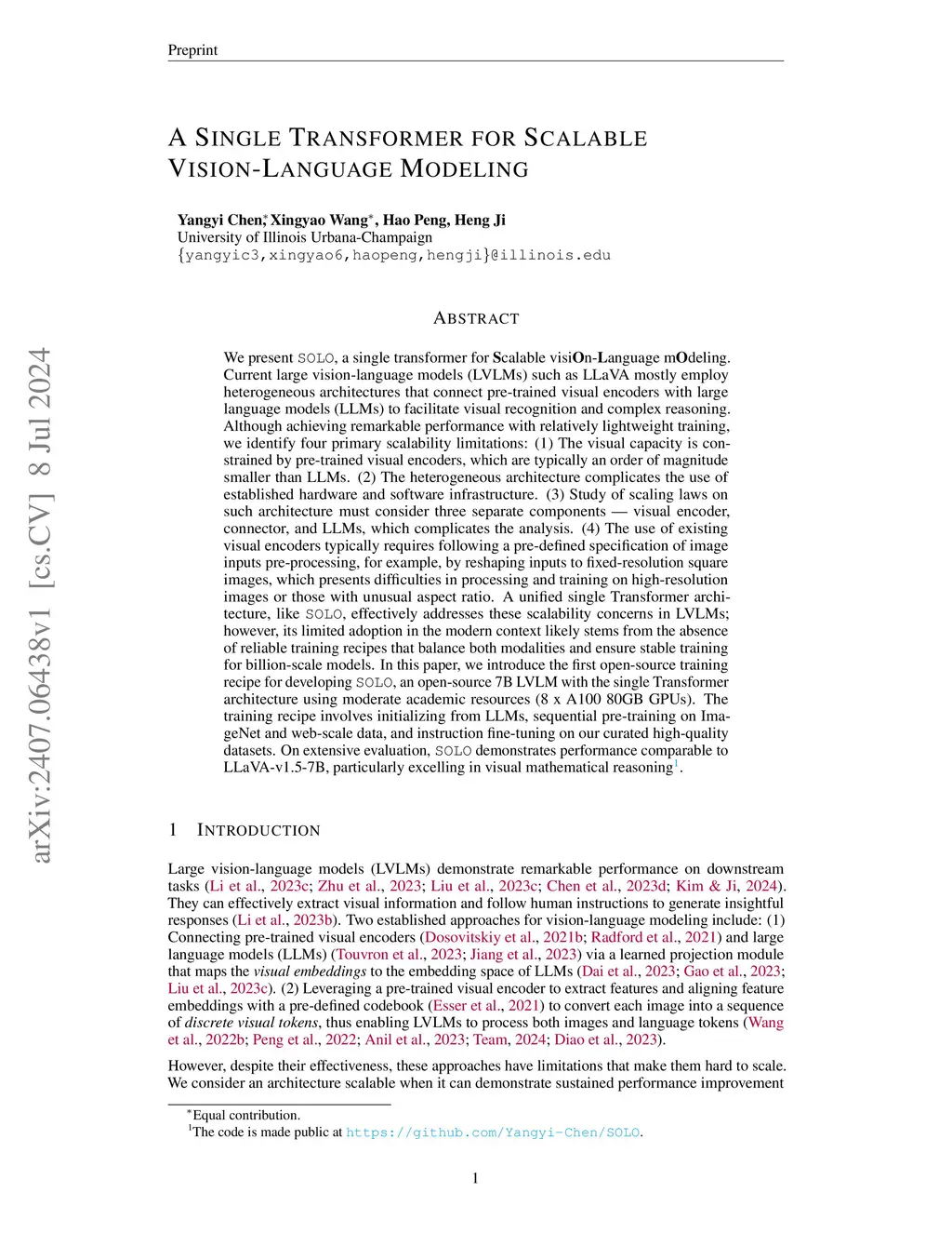 We present SOLO, a single transformer for Scalable visiOn-Language mOdeling. Current large vision-language models (LVLMs) such as LLaVA mostly employ heterogeneous architectures that connect pre-trained visual encoders with large language models (LLMs) to facilitate visual recognition and complex reasoning. Although achieving remarkable performance with relatively lightweight training, we identify four primary scalability limitations: (1) The visual capacity is constrained by pre-trained visual encoders, which are typically an order of magnitude smaller than LLMs. (2) The heterogeneous architecture complicates the use of established hardware and software infrastructure. (3) Study of scaling laws on such architecture must consider three separate components - visual encoder, connector, and LLMs, which complicates the analysis. (4) The use of existing visual encoders typically requires following a pre-defined specification of image inputs pre-processing, for example, by reshaping inputs to fixed-resolution square images, which presents difficulties in processing and training on high-resolution images or those with unusual aspect ratio. A unified single Transformer architecture, like SOLO, effectively addresses these scalability concerns in LVLMs; however, its limited adoption in the modern context likely stems from the absence of reliable training recipes that balance both modalities and ensure stable training for billion-scale models. In this paper, we introduce the first open-source training recipe for developing SOLO, an open-source 7B LVLM using moderate academic resources. The training recipe involves initializing from LLMs, sequential pre-training on ImageNet and web-scale data, and instruction fine-tuning on our curated high-quality datasets. On extensive evaluation, SOLO demonstrates performance comparable to LLaVA-v1.5-7B, particularly excelling in visual mathematical reasoning.