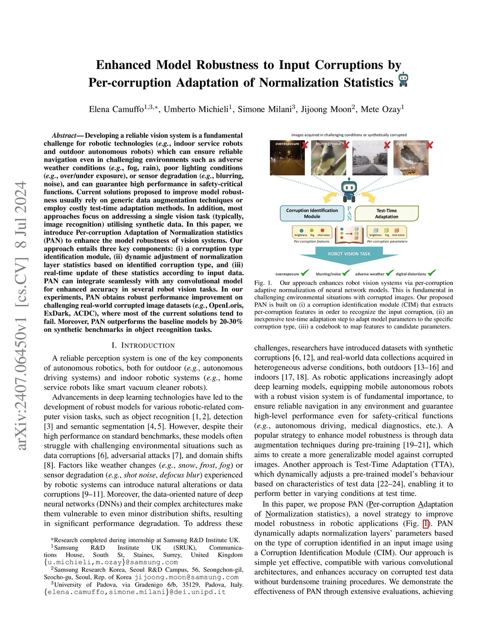 Developing a reliable vision system is a fundamental challenge for robotic technologies (e.g., indoor service robots and outdoor autonomous robots) which can ensure reliable navigation even in challenging environments such as adverse weather conditions (e.g., fog, rain), poor lighting conditions (e.g., over/under exposure), or sensor degradation (e.g., blurring, noise), and can guarantee high performance in safety-critical functions. Current solutions proposed to improve model robustness usually rely on generic data augmentation techniques or employ costly test-time adaptation methods. In addition, most approaches focus on addressing a single vision task (typically, image recognition) utilising synthetic data. In this paper, we introduce Per-corruption Adaptation of Normalization statistics (PAN) to enhance the model robustness of vision systems. Our approach entails three key components: (i) a corruption type identification module, (ii) dynamic adjustment of normalization layer statistics based on identified corruption type, and (iii) real-time update of these statistics according to input data. PAN can integrate seamlessly with any convolutional model for enhanced accuracy in several robot vision tasks. In our experiments, PAN obtains robust performance improvement on challenging real-world corrupted image datasets (e.g., OpenLoris, ExDark, ACDC), where most of the current solutions tend to fail. Moreover, PAN outperforms the baseline models by 20-30% on synthetic benchmarks in object recognition tasks.