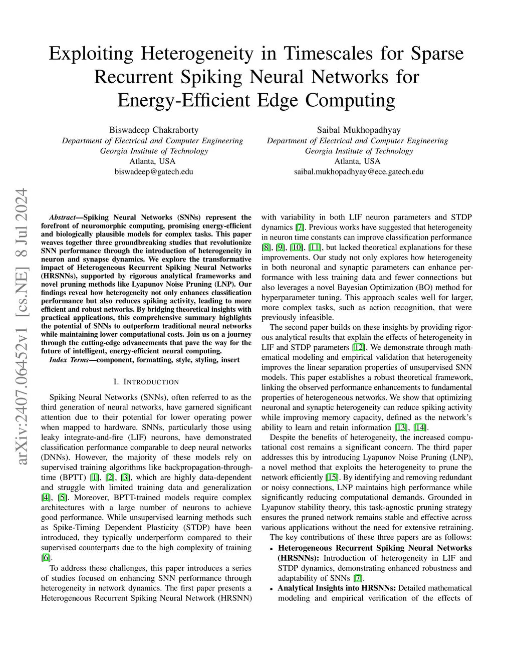 Spiking Neural Networks (SNNs) represent the forefront of neuromorphic computing, promising energy-efficient and biologically plausible models for complex tasks. This paper weaves together three groundbreaking studies that revolutionize SNN performance through the introduction of heterogeneity in neuron and synapse dynamics. We explore the transformative impact of Heterogeneous Recurrent Spiking Neural Networks (HRSNNs), supported by rigorous analytical frameworks and novel pruning methods like Lyapunov Noise Pruning (LNP). Our findings reveal how heterogeneity not only enhances classification performance but also reduces spiking activity, leading to more efficient and robust networks. By bridging theoretical insights with practical applications, this comprehensive summary highlights the potential of SNNs to outperform traditional neural networks while maintaining lower computational costs. Join us on a journey through the cutting-edge advancements that pave the way for the future of intelligent, energy-efficient neural computing.