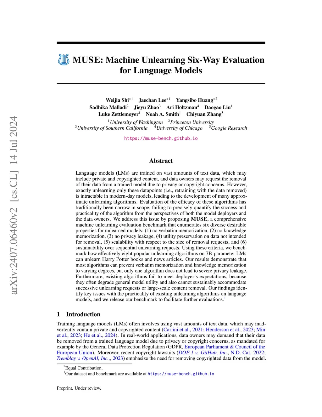 MUSE: Machine Unlearning Six-Way Evaluation for Language Models