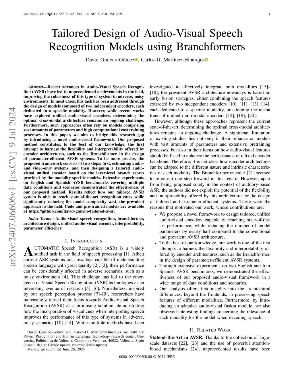 Recent advances in Audio-Visual Speech Recognition (AVSR) have led to unprecedented achievements in the field, improving the robustness of this type of system in adverse, noisy environments. In most cases, this task has been addressed through the design of models composed of two independent encoders, each dedicated to a specific modality. However, while recent works have explored unified audio-visual encoders, determining the optimal cross-modal architecture remains an ongoing challenge. Furthermore, such approaches often rely on models comprising vast amounts of parameters and high computational cost training processes. In this paper, we aim to bridge this research gap by introducing a novel audio-visual framework. Our proposed method constitutes, to the best of our knowledge, the first attempt to harness the flexibility and interpretability offered by encoder architectures, such as the Branchformer, in the design of parameter-efficient AVSR systems. To be more precise, the proposed framework consists of two steps: first, estimating audio- and video-only systems, and then designing a tailored audio-visual unified encoder based on the layer-level branch scores provided by the modality-specific models. Extensive experiments on English and Spanish AVSR benchmarks covering multiple data conditions and scenarios demonstrated the effectiveness of our proposed method. Even when trained on a moderate scale of data, our models achieve competitive word error rates (WER) of approximately 2.5\% for English and surpass existing approaches for Spanish, establishing a new benchmark with an average WER of around 9.1\%. These results reflect how our tailored AVSR system is able to reach state-of-the-art recognition rates while significantly reducing the model complexity w.r.t. the prevalent approach in the field. Code and pre-trained models are available atthis https URL.