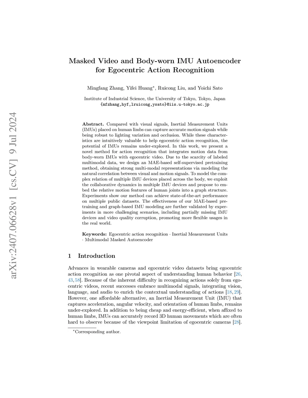 Compared with visual signals, Inertial Measurement Units (IMUs) placed on human limbs can capture accurate motion signals while being robust to lighting variation and occlusion. While these characteristics are intuitively valuable to help egocentric action recognition, the potential of IMUs remains under-explored. In this work, we present a novel method for action recognition that integrates motion data from body-worn IMUs with egocentric video. Due to the scarcity of labeled multimodal data, we design an MAE-based self-supervised pretraining method, obtaining strong multi-modal representations via modeling the natural correlation between visual and motion signals. To model the complex relation of multiple IMU devices placed across the body, we exploit the collaborative dynamics in multiple IMU devices and propose to embed the relative motion features of human joints into a graph structure. Experiments show our method can achieve state-of-the-art performance on multiple public datasets. The effectiveness of our MAE-based pretraining and graph-based IMU modeling are further validated by experiments in more challenging scenarios, including partially missing IMU devices and video quality corruption, promoting more flexible usages in the real world.