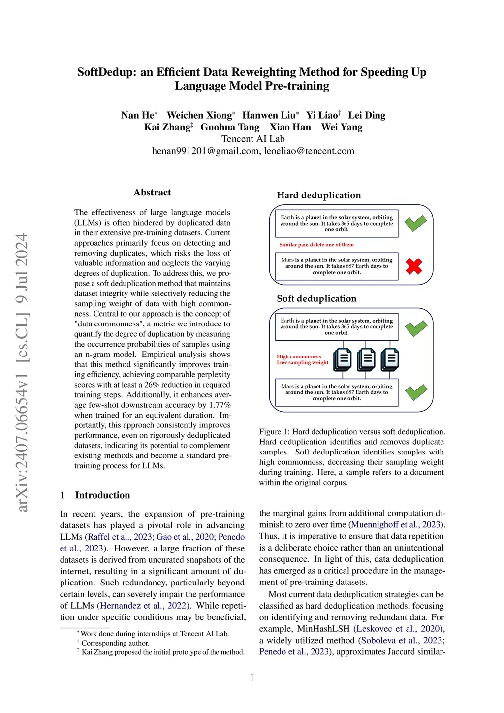 The effectiveness of large language models (LLMs) is often hindered by duplicated data in their extensive pre-training datasets. Current approaches primarily focus on detecting and removing duplicates, which risks the loss of valuable information and neglects the varying degrees of duplication. To address this, we propose a soft deduplication method that maintains dataset integrity while selectively reducing the sampling weight of data with high commonness. Central to our approach is the concept of "data commonness", a metric we introduce to quantify the degree of duplication by measuring the occurrence probabilities of samples using an n-gram model. Empirical analysis shows that this method significantly improves training efficiency, achieving comparable perplexity scores with at least a 26% reduction in required training steps. Additionally, it enhances average few-shot downstream accuracy by 1.77% when trained for an equivalent duration. Importantly, this approach consistently improves performance, even on rigorously deduplicated datasets, indicating its potential to complement existing methods and become a standard pre-training process for LLMs.