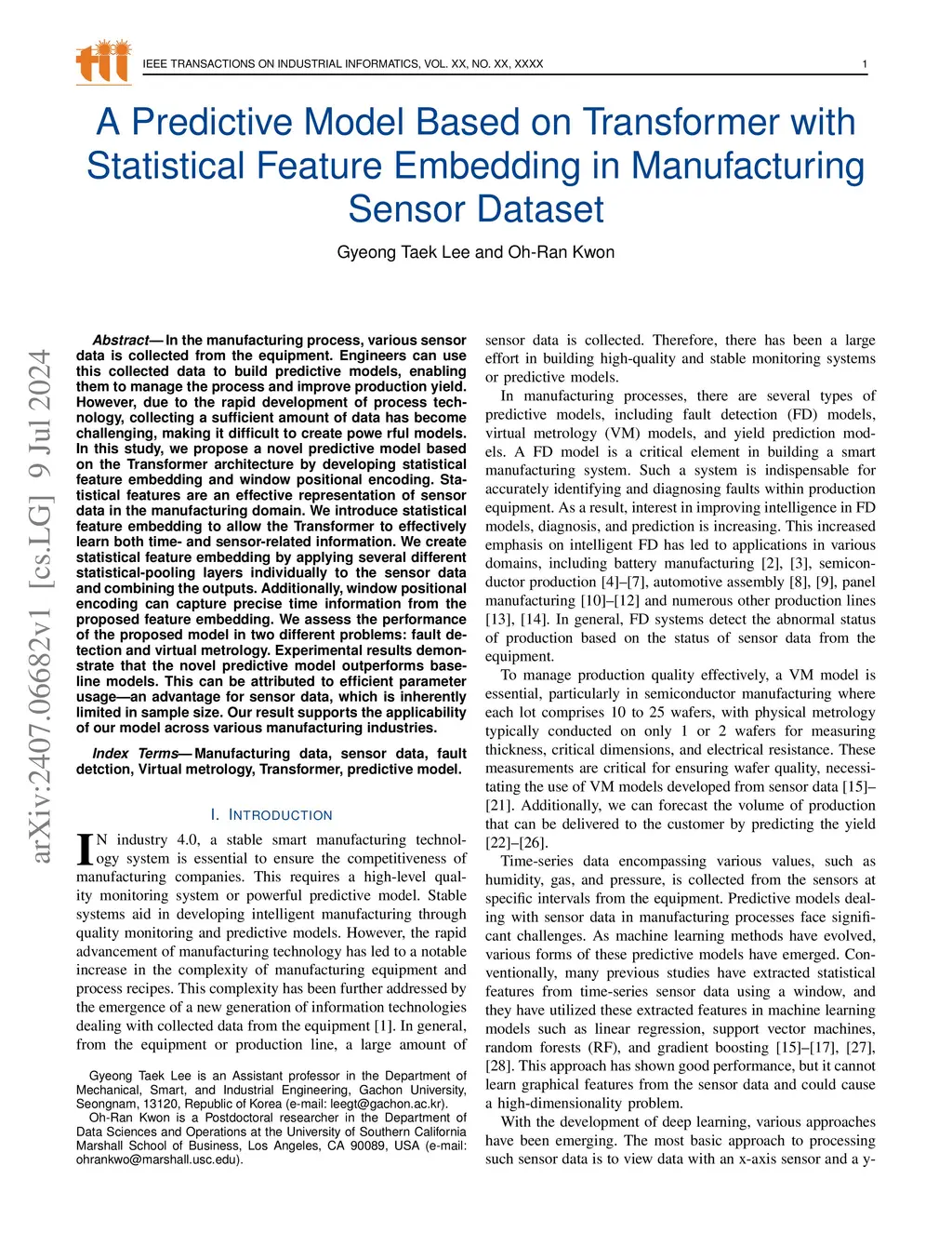 In the manufacturing process, sensor data collected from equipment is crucial for building predictive models to manage processes and improve productivity. However, in the field, it is challenging to gather sufficient data to build robust models. This study proposes a novel predictive model based on the Transformer, utilizing statistical feature embedding and window positional encoding. Statistical features provide an effective representation of sensor data, and the embedding enables the Transformer to learn both time- and sensor-related information. Window positional encoding captures precise time details from the feature embedding. The model's performance is evaluated in two problems: fault detection and virtual metrology, showing superior results compared to baseline models. This improvement is attributed to the efficient use of parameters, which is particularly beneficial for sensor data that often has limited sample sizes. The results support the model's applicability across various manufacturing industries, demonstrating its potential for enhancing process management and yield.