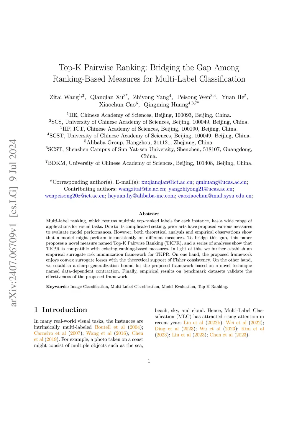 Multi-label ranking, which returns multiple top-ranked labels for each instance, has a wide range of applications for visual tasks. Due to its complicated setting, prior arts have proposed various measures to evaluate model performances. However, both theoretical analysis and empirical observations show that a model might perform inconsistently on different measures. To bridge this gap, this paper proposes a novel measure named Top-K Pairwise Ranking (TKPR), and a series of analyses show that TKPR is compatible with existing ranking-based measures. In light of this, we further establish an empirical surrogate risk minimization framework for TKPR. On one hand, the proposed framework enjoys convex surrogate losses with the theoretical support of Fisher consistency. On the other hand, we establish a sharp generalization bound for the proposed framework based on a novel technique named data-dependent contraction. Finally, empirical results on benchmark datasets validate the effectiveness of the proposed framework.