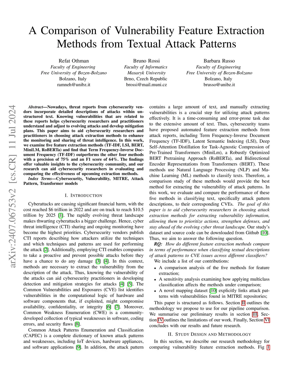 Nowadays, threat reports from cybersecurity vendors incorporate detailed descriptions of attacks within unstructured text. Knowing vulnerabilities that are related to these reports helps cybersecurity researchers and practitioners understand and adjust to evolving attacks and develop mitigation plans. This paper aims to aid cybersecurity researchers and practitioners in choosing attack extraction methods to enhance the monitoring and sharing of threat intelligence. In this work, we examine five feature extraction methods (TF-IDF, LSI, BERT, MiniLM, RoBERTa) and find that Term Frequency-Inverse Document Frequency (TF-IDF) outperforms the other four methods with a precision of 75\% and an F1 score of 64\%. The findings offer valuable insights to the cybersecurity community, and our research can aid cybersecurity researchers in evaluating and comparing the effectiveness of upcoming extraction methods.