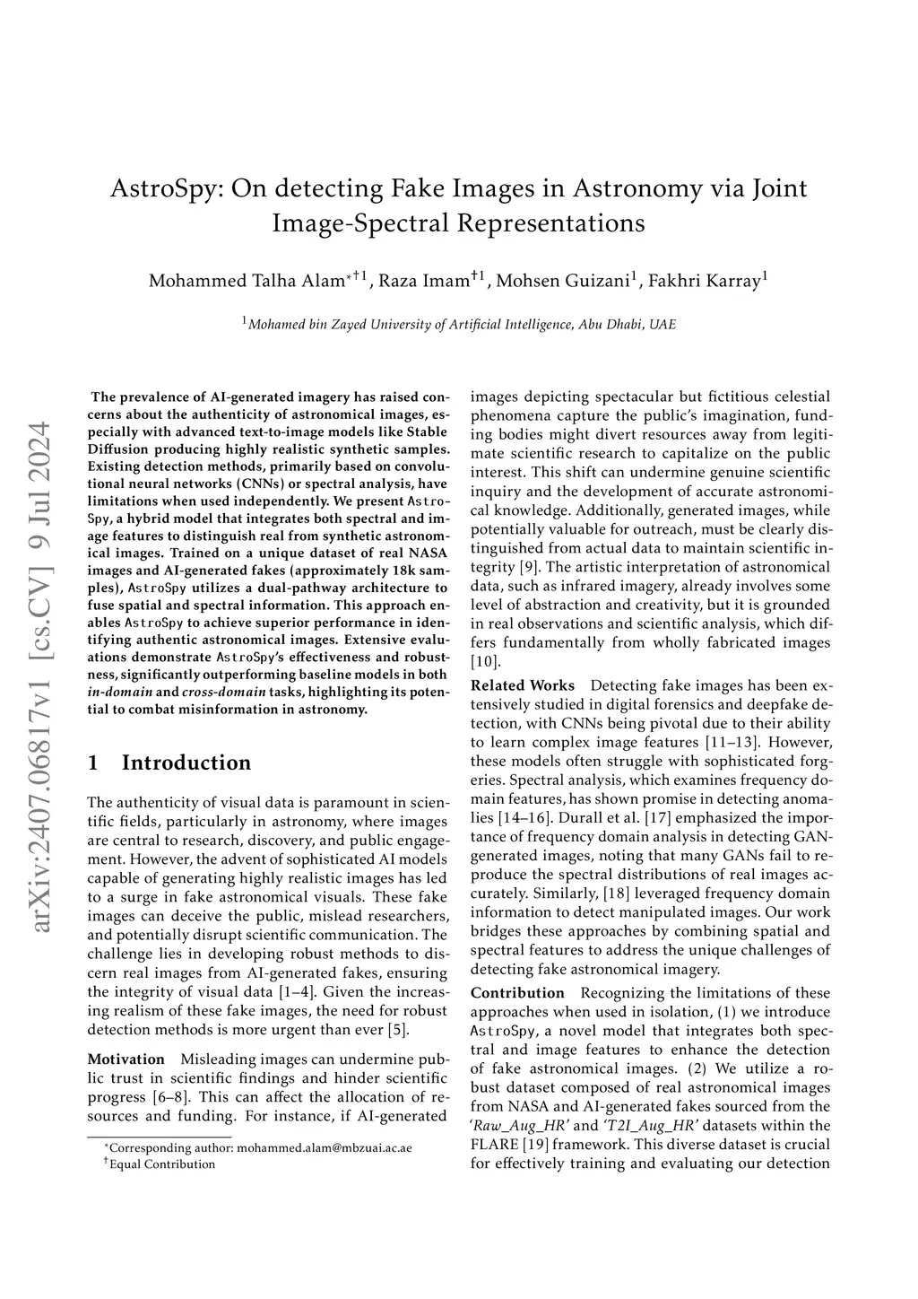 The prevalence of AI-generated imagery has raised concerns about the authenticity of astronomical images, especially with advanced text-to-image models like Stable Diffusion producing highly realistic synthetic samples. Existing detection methods, primarily based on convolutional neural networks (CNNs) or spectral analysis, have limitations when used independently. We present AstroSpy, a hybrid model that integrates both spectral and image features to distinguish real from synthetic astronomical images. Trained on a unique dataset of real NASA images and AI-generated fakes (approximately 18k samples), AstroSpy utilizes a dual-pathway architecture to fuse spatial and spectral information. This approach enables AstroSpy to achieve superior performance in identifying authentic astronomical images. Extensive evaluations demonstrate AstroSpy's effectiveness and robustness, significantly outperforming baseline models in both in-domain and cross-domain tasks, highlighting its potential to combat misinformation in astronomy.
