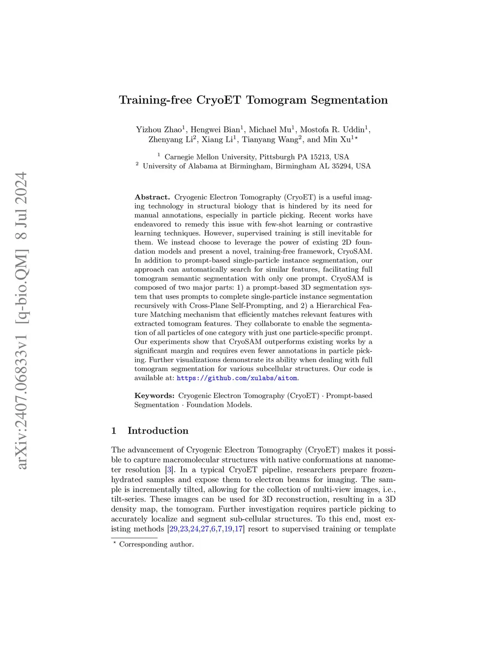Cryogenic Electron Tomography (CryoET) is a useful imaging technology in structural biology that is hindered by its need for manual annotations, especially in particle picking. Recent works have endeavored to remedy this issue with few-shot learning or contrastive learning techniques. However, supervised training is still inevitable for them. We instead choose to leverage the power of existing 2D foundation models and present a novel, training-free framework, CryoSAM. In addition to prompt-based single-particle instance segmentation, our approach can automatically search for similar features, facilitating full tomogram semantic segmentation with only one prompt. CryoSAM is composed of two major parts: 1) a prompt-based 3D segmentation system that uses prompts to complete single-particle instance segmentation recursively with Cross-Plane Self-Prompting, and 2) a Hierarchical Feature Matching mechanism that efficiently matches relevant features with extracted tomogram features. They collaborate to enable the segmentation of all particles of one category with just one particle-specific prompt. Our experiments show that CryoSAM outperforms existing works by a significant margin and requires even fewer annotations in particle picking. Further visualizations demonstrate its ability when dealing with full tomogram segmentation for various subcellular structures. Our code is available at: https://github.com/xulabs/aitom
