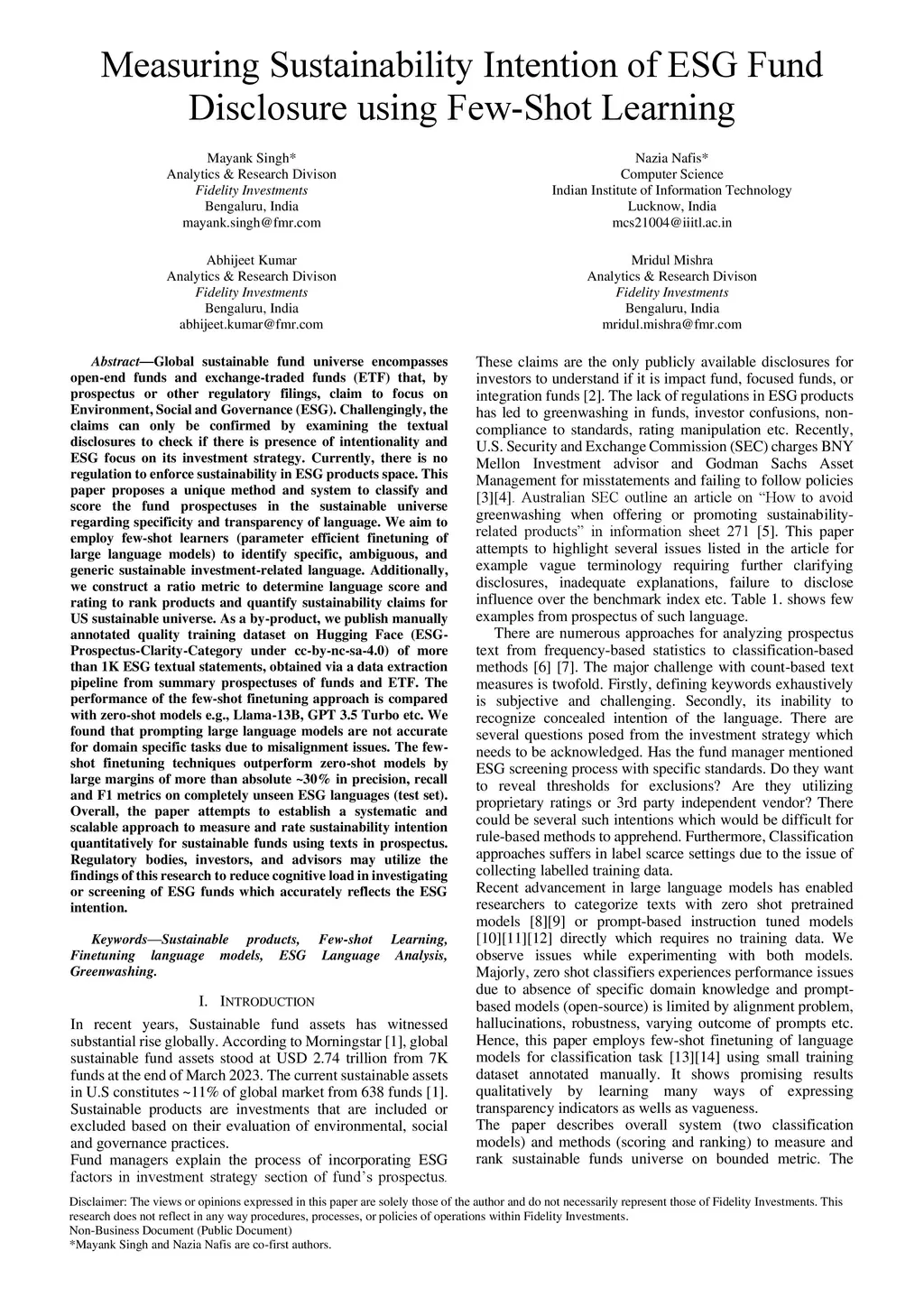 Measuring Sustainability Intention of ESG Fund Disclosure using Few-Shot