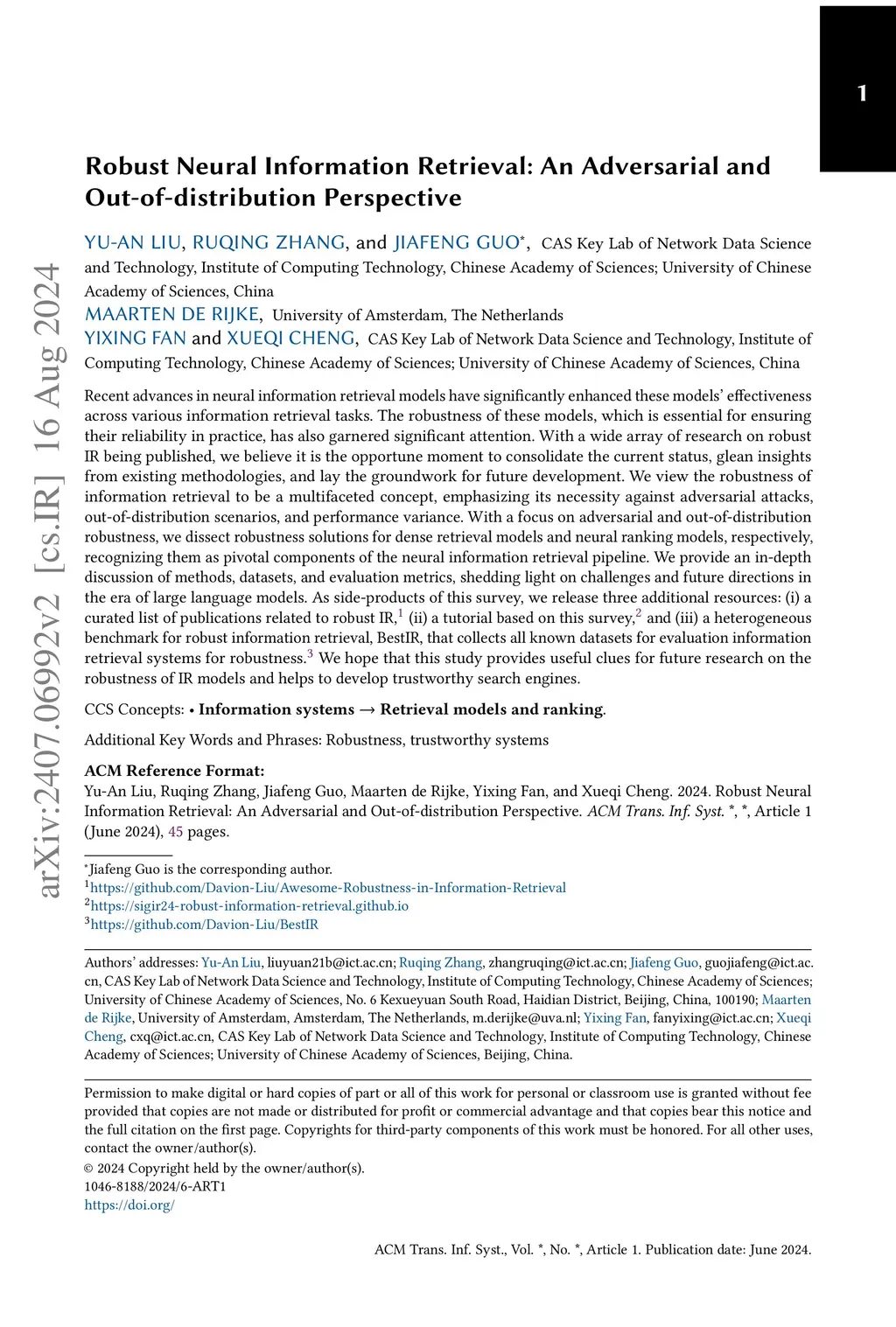 Recent advances in neural information retrieval (IR) models have significantly enhanced their effectiveness over various IR tasks. The robustness of these models, essential for ensuring their reliability in practice, has also garnered significant attention. With a wide array of research on robust IR being proposed, we believe it is the opportune moment to consolidate the current status, glean insights from existing methodologies, and lay the groundwork for future development. We view the robustness of IR to be a multifaceted concept, emphasizing its necessity against adversarial attacks, out-of-distribution (OOD) scenarios and performance variance. With a focus on adversarial and OOD robustness, we dissect robustness solutions for dense retrieval models (DRMs) and neural ranking models (NRMs), respectively, recognizing them as pivotal components of the neural IR pipeline. We provide an in-depth discussion of existing methods, datasets, and evaluation metrics, shedding light on challenges and future directions in the era of large language models. To the best of our knowledge, this is the first comprehensive survey on the robustness of neural IR models, and we will also be giving our first tutorial presentation at SIGIR 2024 \url{https://sigir2024-robust-information-retrieval.github.io}. Along with the organization of existing work, we introduce a Benchmark for robust IR (BestIR), a heterogeneous evaluation benchmark for robust neural information retrieval, which is publicly available at \url{https://github.com/Davion-Liu/BestIR}. We hope that this study provides useful clues for future research on the robustness of IR models and helps to develop trustworthy search engines \url{https://github.com/Davion-Liu/Awesome-Robustness-in-Information-Retrieval}.