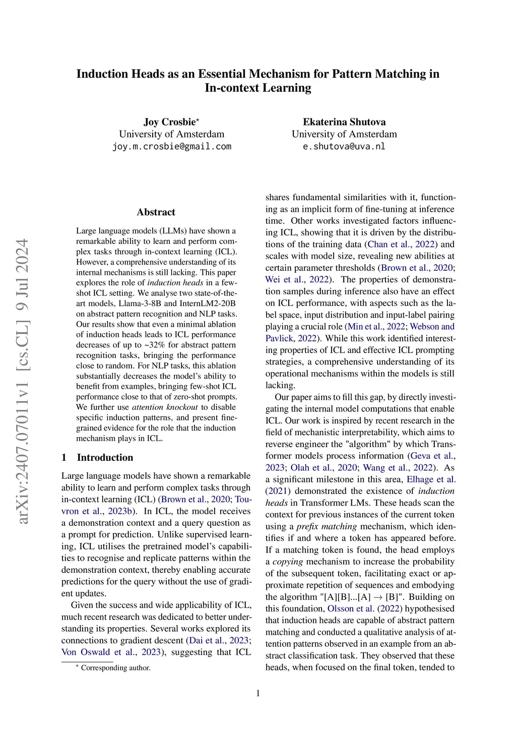 Large language models (LLMs) have shown a remarkable ability to learn and perform complex tasks through in-context learning (ICL). However, a comprehensive understanding of its internal mechanisms is still lacking. This paper explores the role of induction heads in a few-shot ICL setting. We analyse two state-of-the-art models, Llama-3-8B and InternLM2-20B on abstract pattern recognition and NLP tasks. Our results show that even a minimal ablation of induction heads leads to ICL performance decreases of up to ~32% for abstract pattern recognition tasks, bringing the performance close to random. For NLP tasks, this ablation substantially decreases the model's ability to benefit from examples, bringing few-shot ICL performance close to that of zero-shot prompts. We further use attention knockout to disable specific induction patterns, and present fine-grained evidence for the role that the induction mechanism plays in ICL.