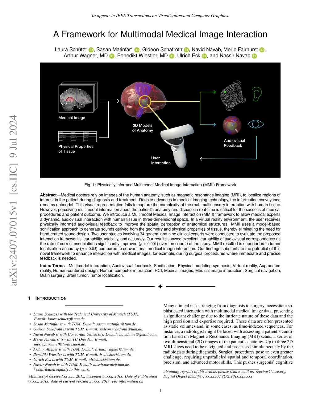 Medical doctors rely on images of the human anatomy, such as magnetic resonance imaging (MRI), to localize regions of interest in the patient during diagnosis and treatment. Despite advances in medical imaging technology, the information conveyance remains unimodal. This visual representation fails to capture the complexity of the real, multisensory interaction with human tissue. However, perceiving multimodal information about the patient's anatomy and disease in real-time is critical for the success of medical procedures and patient outcome. We introduce a Multimodal Medical Image Interaction (MMII) framework to allow medical experts a dynamic, audiovisual interaction with human tissue in three-dimensional space. In a virtual reality environment, the user receives physically informed audiovisual feedback to improve the spatial perception of anatomical structures. MMII uses a model-based sonification approach to generate sounds derived from the geometry and physical properties of tissue, thereby eliminating the need for hand-crafted sound design. Two user studies involving 34 general and nine clinical experts were conducted to evaluate the proposed interaction framework's learnability, usability, and accuracy. Our results showed excellent learnability of audiovisual correspondence as the rate of correct associations significantly improved (p < 0.001) over the course of the study. MMII resulted in superior brain tumor localization accuracy (p < 0.05) compared to conventional medical image interaction. Our findings substantiate the potential of this novel framework to enhance interaction with medical images, for example, during surgical procedures where immediate and precise feedback is needed.