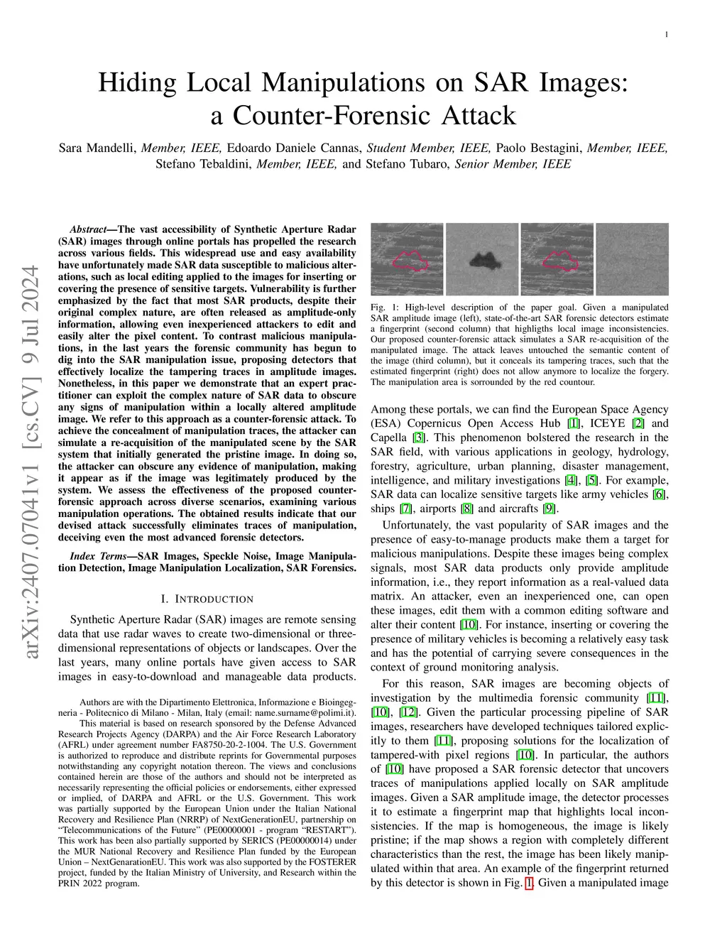 The vast accessibility of Synthetic Aperture Radar (SAR) images through online portals has propelled the research across various fields. This widespread use and easy availability have unfortunately made SAR data susceptible to malicious alterations, such as local editing applied to the images for inserting or covering the presence of sensitive targets. Vulnerability is further emphasized by the fact that most SAR products, despite their original complex nature, are often released as amplitude-only information, allowing even inexperienced attackers to edit and easily alter the pixel content. To contrast malicious manipulations, in the last years the forensic community has begun to dig into the SAR manipulation issue, proposing detectors that effectively localize the tampering traces in amplitude images. Nonetheless, in this paper we demonstrate that an expert practitioner can exploit the complex nature of SAR data to obscure any signs of manipulation within a locally altered amplitude image. We refer to this approach as a counter-forensic attack. To achieve the concealment of manipulation traces, the attacker can simulate a re-acquisition of the manipulated scene by the SAR system that initially generated the pristine image. In doing so, the attacker can obscure any evidence of manipulation, making it appear as if the image was legitimately produced by the system. This attack has unique features that make it both highly generalizable and relatively easy to apply. First, it is a black-box attack, meaning it is not designed to deceive a specific forensic detector. Furthermore, it does not require a training phase and is not based on adversarial operations. We assess the effectiveness of the proposed counter-forensic approach across diverse scenarios, examining various manipulation operations.