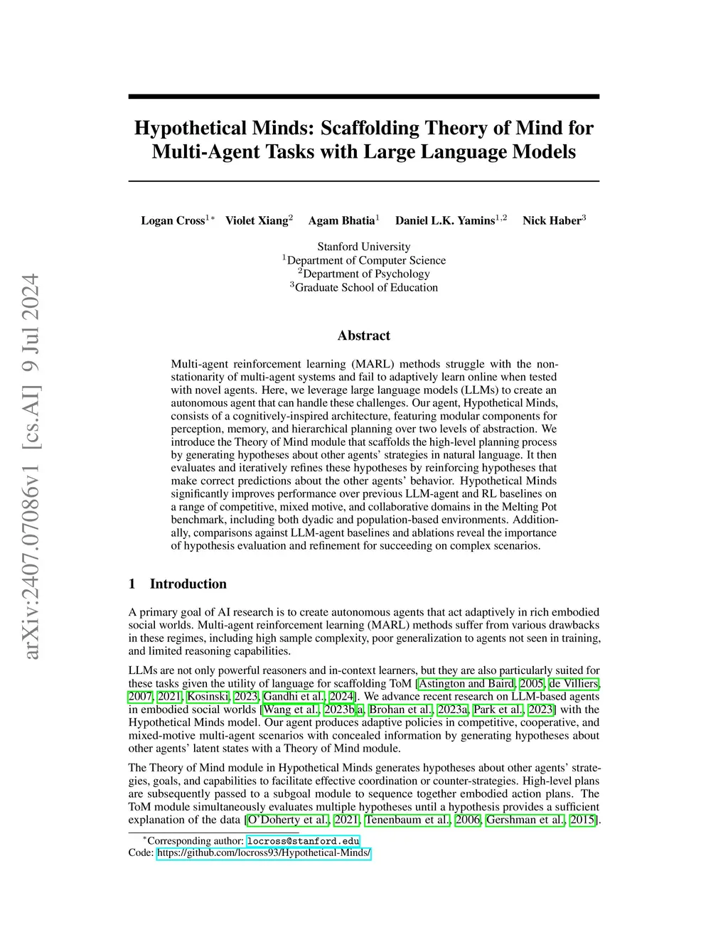 Hypothetical Minds: Scaffolding Theory of Mind for Multi-Agent Tasks