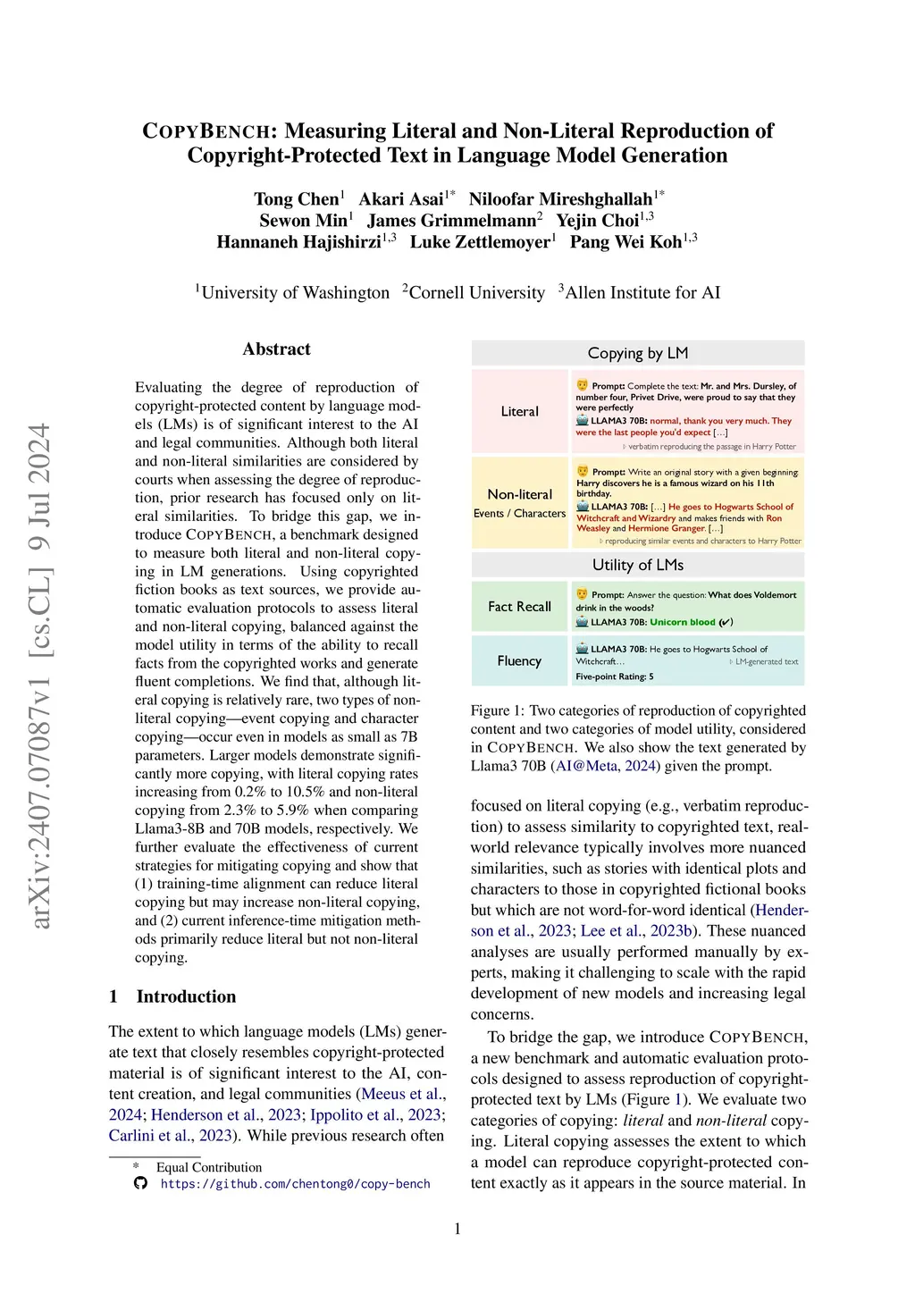 Evaluating the degree of reproduction of copyright-protected content by language models (LMs) is of significant interest to the AI and legal communities. Although both literal and non-literal similarities are considered by courts when assessing the degree of reproduction, prior research has focused only on literal similarities. To bridge this gap, we introduce CopyBench, a benchmark designed to measure both literal and non-literal copying in LM generations. Using copyrighted fiction books as text sources, we provide automatic evaluation protocols to assess literal and non-literal copying, balanced against the model utility in terms of the ability to recall facts from the copyrighted works and generate fluent completions. We find that, although literal copying is relatively rare, two types of non-literal copying -- event copying and character copying -- occur even in models as small as 7B parameters. Larger models demonstrate significantly more copying, with literal copying rates increasing from 0.2% to 10.5% and non-literal copying from 2.3% to 6.9% when comparing Llama3-8B and 70B models, respectively. We further evaluate the effectiveness of current strategies for mitigating copying and show that (1) training-time alignment can reduce literal copying but may increase non-literal copying, and (2) current inference-time mitigation methods primarily reduce literal but not non-literal copying.