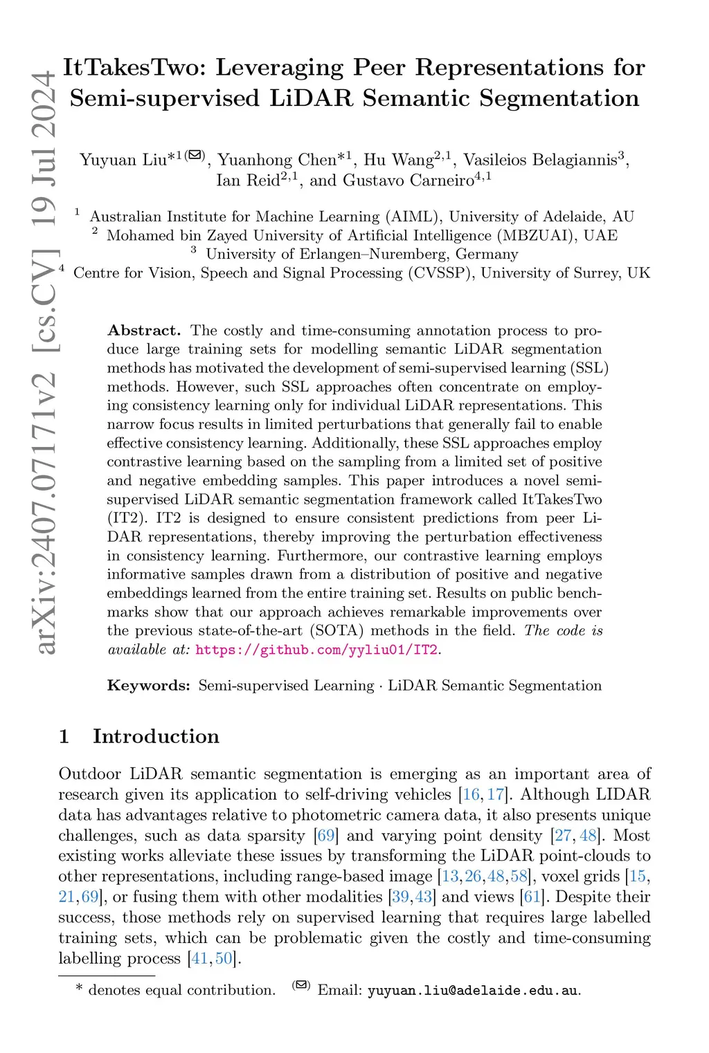 The costly and time-consuming annotation process to produce large training sets for modelling semantic LiDAR segmentation methods has motivated the development of semi-supervised learning (SSL) methods. However, such SSL approaches often concentrate on employing consistency learning only for individual LiDAR representations. This narrow focus results in limited perturbations that generally fail to enable effective consistency learning. Additionally, these SSL approaches employ contrastive learning based on the sampling from a limited set of positive and negative embedding samples. This paper introduces a novel semi-supervised LiDAR semantic segmentation framework called ItTakesTwo (IT2). IT2 is designed to ensure consistent predictions from peer LiDAR representations, thereby improving the perturbation effectiveness in consistency learning. Furthermore, our contrastive learning employs informative samples drawn from a distribution of positive and negative embeddings learned from the entire training set. Results on public benchmarks show that our approach achieves remarkable improvements over the previous state-of-the-art (SOTA) methods in the field. The code is available at:this https URL.