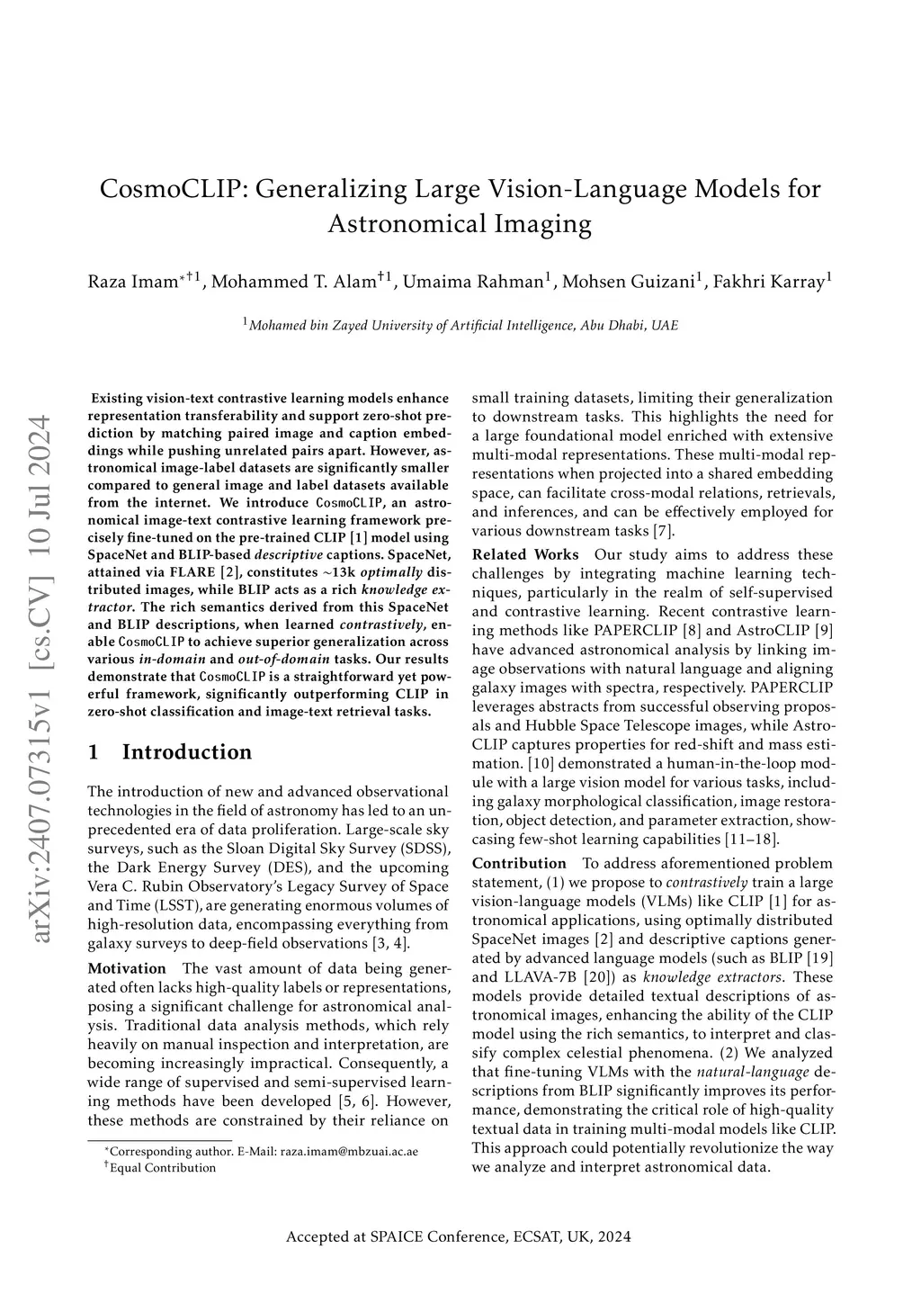 Existing vision-text contrastive learning models enhance representation transferability and support zero-shot prediction by matching paired image and caption embeddings while pushing unrelated pairs apart. However, astronomical image-label datasets are significantly smaller compared to general image and label datasets available from the internet. We introduce CosmoCLIP, an astronomical image-text contrastive learning framework precisely fine-tuned on the pre-trained CLIP model using SpaceNet and BLIP-based captions. SpaceNet, attained via FLARE, constitutes ~13k optimally distributed images, while BLIP acts as a rich knowledge extractor. The rich semantics derived from this SpaceNet and BLIP descriptions, when learned contrastively, enable CosmoCLIP to achieve superior generalization across various in-domain and out-of-domain tasks. Our results demonstrate that CosmoCLIP is a straightforward yet powerful framework, significantly outperforming CLIP in zero-shot classification and image-text retrieval tasks.
